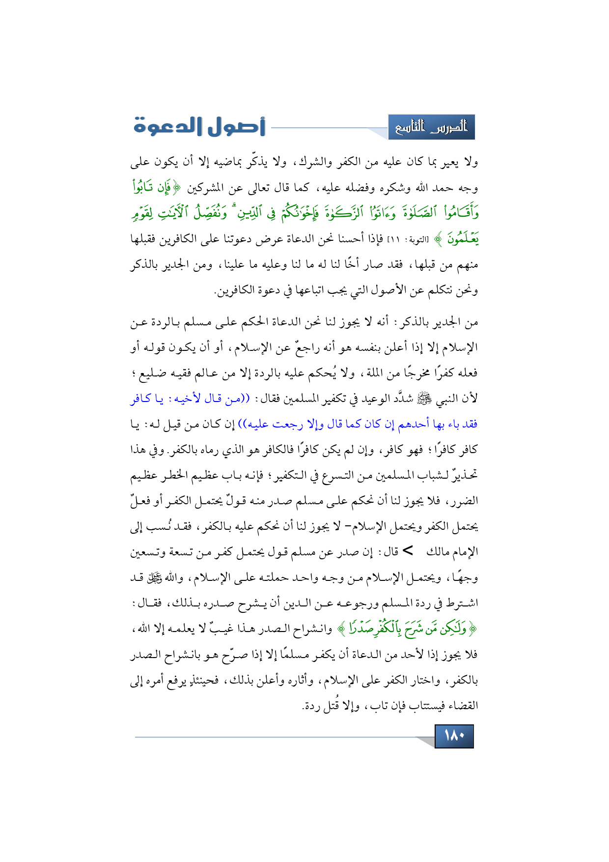 من الجدير بالذكر: أنه لا يجوز لنا نحن الدعاة الحكم على مسلم بالردة عن الإسلام إلا إذا أعلن بنفسه هو أنه راجعٌ عن الإسلام، أو أن يكون قوله أو فعله كفرًا مخرجًا من الملة، ولا يُحكم عليه بالردة إلا من عالم فقيه ضليع؛ لأن النبي -صلى الله عليه وسلم- شدَّد الوعيد في تكفير المسلمين فقال: ((من قال لأخيه: يا كافر فقد باء بها أحدهم إن كان كما قال وإلا رجعت عليه)) إن كان من قيل له: يا كافر كافرًا؛ فهو كافر، وإن لم يكن كافرًا فالكافر هو الذي رماه بالكفر. وفي هذا تحذيرٌ لشباب المسلمين من التسرع في التكفير؛ فإنه باب عظيم الخطر عظيم الضرر، فلا يجوز لنا أن نحكم على مسلم صدر منه قولٌ يحتمل الكفر أو فعلٌ يحتمل الكفر ويحتمل الإسلام- لا يجوز لنا أن نحكم عليه بالكفر، فقد نُسب إلى الإمام مالك -رضي الله عنه- قال: إن صدر عن مسلم قول يحتمل كفر من تسعة وتسعين وجهًا، ويحتمل الإسلام من وجه واحد حملته على الإسلام، والله -سبحانه وتعالى- قد اشترط في ردة المسلم ورجوعه عن الدين أن يشرح صدره بذلك، فقال: {وَلَكِن مَّن شَرَحَ بِالْكُفْرِ صَدْرًا} وانشراح الصدر هذا غيبٌ لا يعلمه إلا الله، فلا يجوز إذا لأحد من الدعاة أن يكفر مسلمًا إلا إذا صرّح هو بانشراح الصدر بالكفر، واختار الكفر على الإسلام، وأثاره وأعلن بذلك، فحينئذٍ يرفع أمره إلى القضاء فيستتاب فإن تاب، وإلا قُتل ردة.