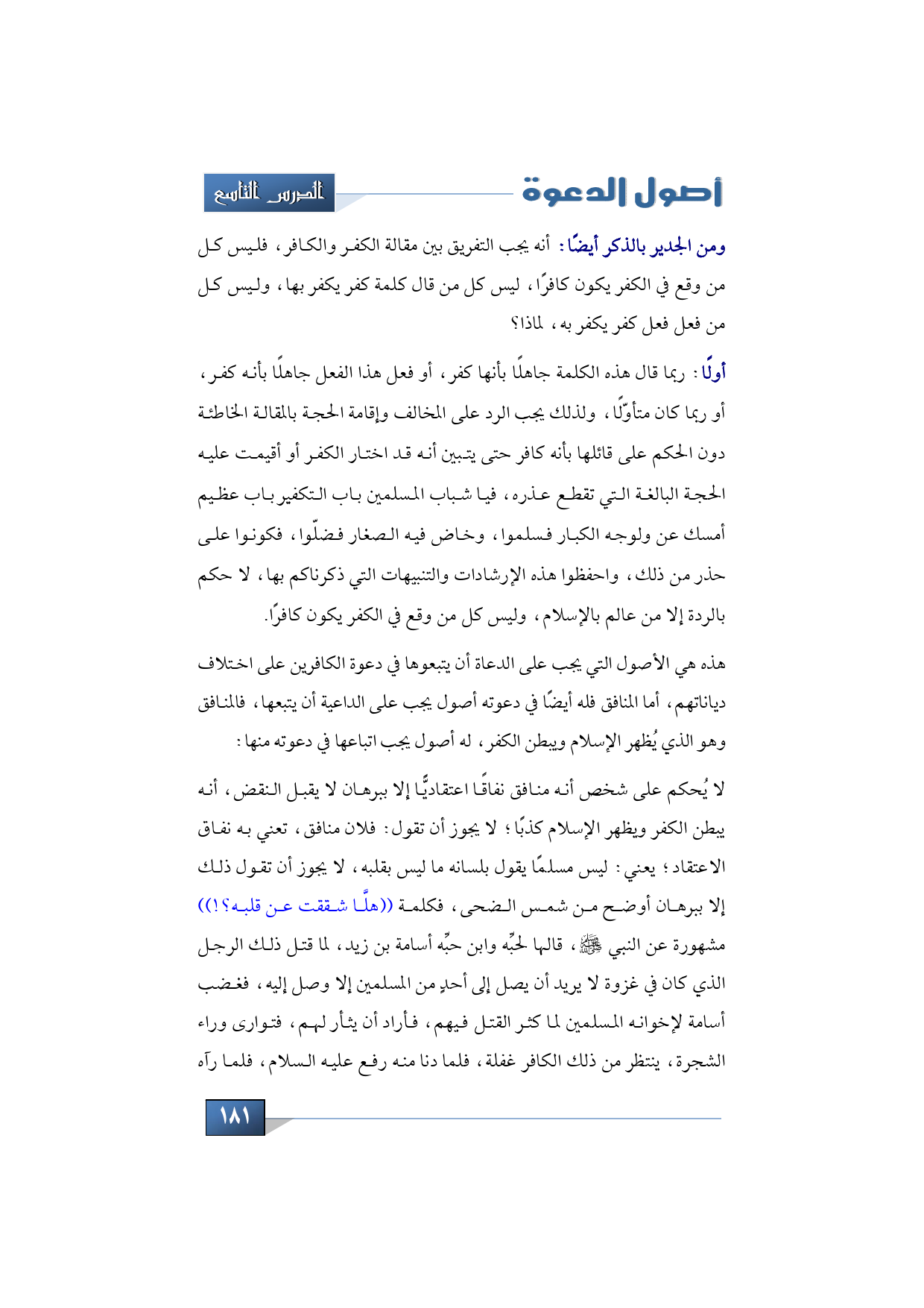 لا يُحكم على شخص أنه منافق نفاقًا اعتقاديًّا إلا ببرهان لا يقبل النقض، أنه يبطن الكفر ويظهر الإسلام كذبًا؛ لا يجوز أن تقول: فلان منافق، تعني به نفاق الاعتقاد؛ يعني: ليس مسلمًا يقول بلسانه ما ليس بقلبه، لا يجوز أن تقول ذلك إلا ببرهان أوضح من شمس الضحى، فكلمة ((هلَّا شققت عن قلبه؟!)) مشهورة عن النبي -عليه الصلاة والسلام، قالها لحبِّه وابن حبِّه أسامة بن زيد، لما قتل ذلك الرجل الذي كان في غزوة لا يريد أن يصل إلى أحدٍ من المسلمين إلا وصل إليه، فغضب أسامة لإخوانه المسلمين لما كثر القتل فيهم، فأراد أن يثأر لهم، فتوارى وراء الشجرة، ينتظر من ذلك الكافر غفلة، فلما دنا منه رفع عليه السلام، فلما رآه