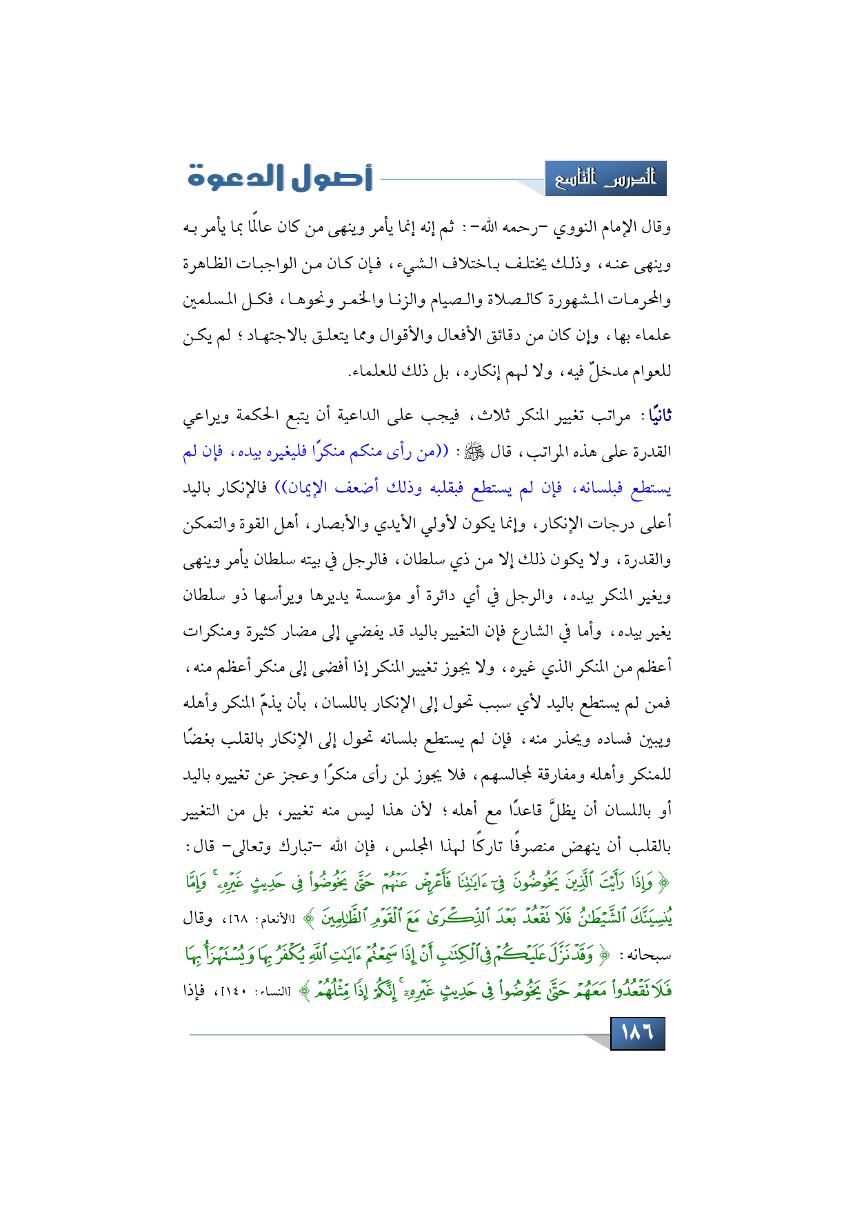 ثانيًا: مراتب تغيير المنكر ثلاث، فيجب على الداعية أن يتبع الحكمة ويراعي القدرة على هذه المراتب، قال -صلى الله عليه وسلم-: ((من رأى منكم منكرًا فليغيره بيده، فإن لم يستطع فبلسانه، فإن لم يستطع فبقلبه وذلك أضعف الإيمان)) فالإنكار باليد أعلى درجات الإنكار، وإنما يكون لأولي الأيدي والأبصار، أهل القوة والتمكن والقدرة، ولا يكون ذلك إلا من ذي سلطان، فالرجل في بيته سلطان يأمر وينهى ويغير المنكر بيده، والرجل في أي دائرة أو مؤسسة يديرها ويرأسها ذو سلطان يغير بيده، وأما في الشارع فإن التغيير باليد قد يفضي إلى مضار كثيرة ومنكرات أعظم من المنكر الذي غيره، ولا يجوز تغيير المنكر إذا أفضى إلى منكر أعظم منه، فمن لم يستطع باليد لأي سبب تحول إلى الإنكار باللسان، بأن يذمّ المنكر وأهله ويبين فساده ويحذر منه، فإن لم يستطع بلسانه تحول إلى الإنكار بالقلب بغضًا للمنكر وأهله ومفارقة لمجالسهم، فلا يجوز لمن رأى منكرًا وعجز عن تغييره باليد أو باللسان أن يظلَّ قاعدًا مع أهله؛ لأن هذا ليس منه تغيير، بل من التغيير بالقلب أن ينهض منصرفًا تاركًا لهذا المجلس، فإن الله -تبارك وتعالى- قال: {وَإِذَا رَأَيْتَ الَّذِينَ يَخُوضُونَ فِي آيَاتِنَا فَأَعْرِضْ عَنْهُمْ حَتَّى يَخُوضُوا فِي حَدِيثٍ غَيْرِهِ وَإِمَّا يُنْسِيَنَّكَ الشَّيْطَانُ فَلَا تَقْعُدْ بَعْدَ الذِّكْرَى مَعَ الْقَوْمِ الظَّالِمِينَ} (الأنعام: 68)، وقال سبحانه: {وَقَدْ نَزَّلَ عَلَيْكُمْ فِي الْكِتَابِ أَنْ إِذَا سَمِعْتُمْ آيَاتِ اللَّهِ يُكْفَرُ بِهَا وَيُسْتَهْزَأُ بِهَا فَلَا تَقْعُدُوا مَعَهُمْ حَتَّى يَخُوضُوا فِي حَدِيثٍ غَيْرِهِ إِنَّكُمْ إِذًا مِثْلُهُمْ} (النساء: 140)، فإذا
