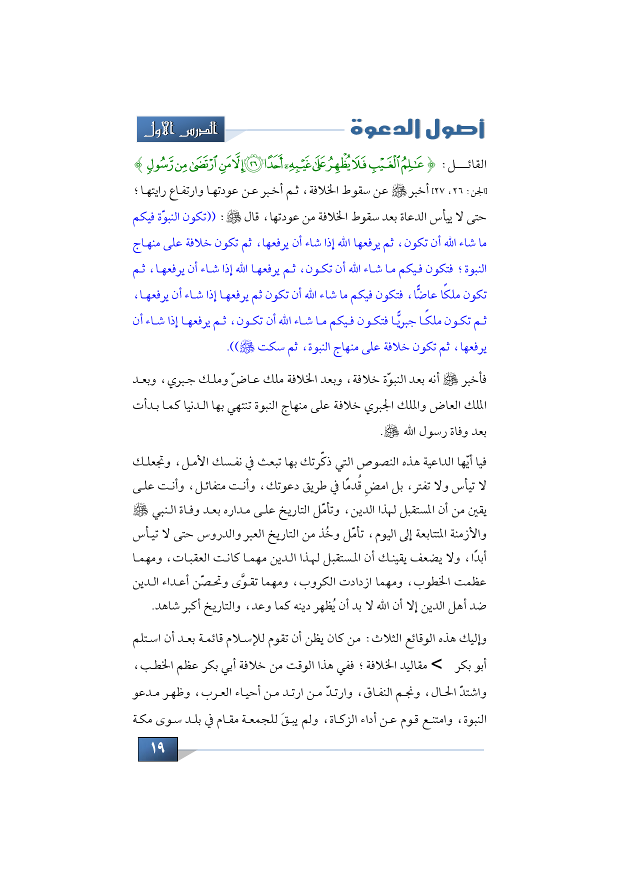 القائل: {عَالِمُ الْغَيْبِ فَلَا يُظْهِرُ عَلَى غَيْبِهِ أَحَدًا * إِلَّا مَنِ ارْتَضَى مِنْ رَسُولٍ} (الجن: 26، 27) أخبر -صلى الله عليه وسلم- عن سقوط الخلافة، ثم أخبر عن عودتها وارتفاع رايتها؛ حتى لا ييأس الدعاة بعد سقوط الخلافة من عودتها، قال -صلى الله عليه وسلم-: ((تكون النبوّة فيكم ما شاء الله أن تكون، ثم يرفعها الله إذا شاء أن يرفعها، ثم تكون خلافة على منهاج النبوة؛ فتكون فيكم ما شاء الله أن تكون، ثم يرفعها الله إذا شاء أن يرفعها، ثم تكون ملكًا عاضًّا، فتكون فيكم ما شاء الله أن تكون ثم يرفعها إذا شاء أن يرفعها، ثم تكون ملكًا جبريًّا فتكون فيكم ما شاء الله أن تكون، ثم يرفعها إذا شاء أن يرفعها، ثم تكون خلافة على منهاج النبوة، ثم سكت -صلى الله عليه وسلم)).