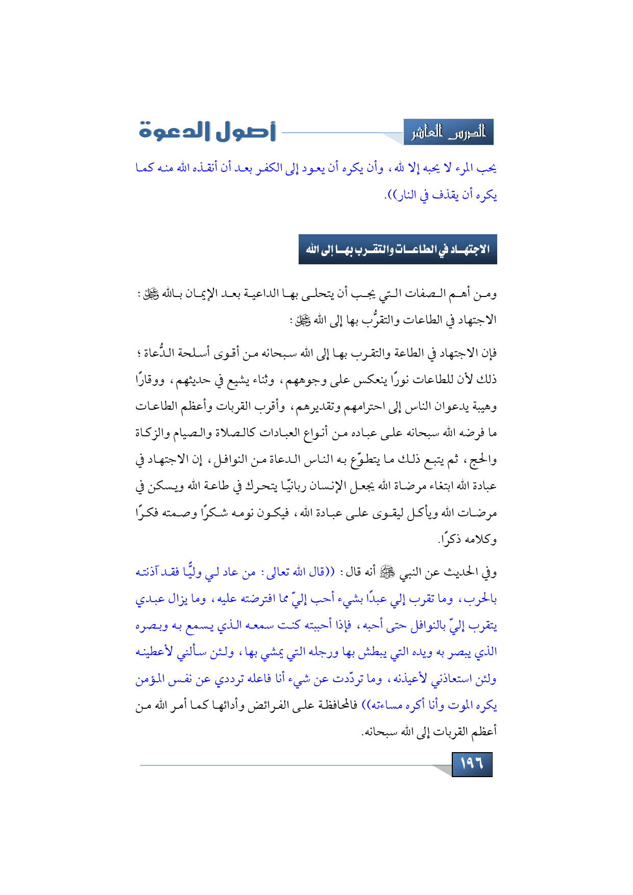 فإن الاجتهاد في الطاعة والتقرب بها إلى الله سبحانه من أقوى أسلحة الدُّعاة؛ ذلك لأن للطاعات نورًا ينعكس على وجوههم، وثناء يشيع في حديثهم، ووقارًا وهيبة يدعوان الناس إلى احترامهم وتقديرهم، وأقرب القربات وأعظم الطاعات ما فرضه الله سبحانه على عباده من أنواع العبادات كالصلاة والصيام والزكاة والحج، ثم يتبع ذلك ما يتطوّع به الناس الدعاة من النوافل، إن الاجتهاد في عبادة الله ابتغاء مرضاة الله يجعل الإنسان ربانيّا يتحرك في طاعة الله ويسكن في مرضات الله ويأكل ليقوى على عبادة الله، فيكون نومه شكرًا وصمته فكرًا وكلامه ذكرًا، في الحديث عن النبي -صلى الله عليه وسلم- أنه قال: ((قال الله تعالى: من عاد لي وليًّا فقد آذنته بالحرب، وما تقرب إلي عبدًا بشيء أحب إليّ مما افترضته عليه، وما يزال عبدي يتقرب إليّ بالنوافل حتى أحبه، فإذا أحببته كنت سمعه الذي يسمع به وبصره الذي يبصر به ويده التي يبطش بها ورجله التي يمشي بها، ولئن سألني لأعطينه ولئن استعاذني لأعيذنه، وما تردّدت عن شيء أنا فاعله ترددي عن نفس المؤمن يكره الموت وأنا أكره مساءته)) فالمحافظة على الفرائض وأدائها كما أمر الله من أعظم القربات إلى الله سبحانه.