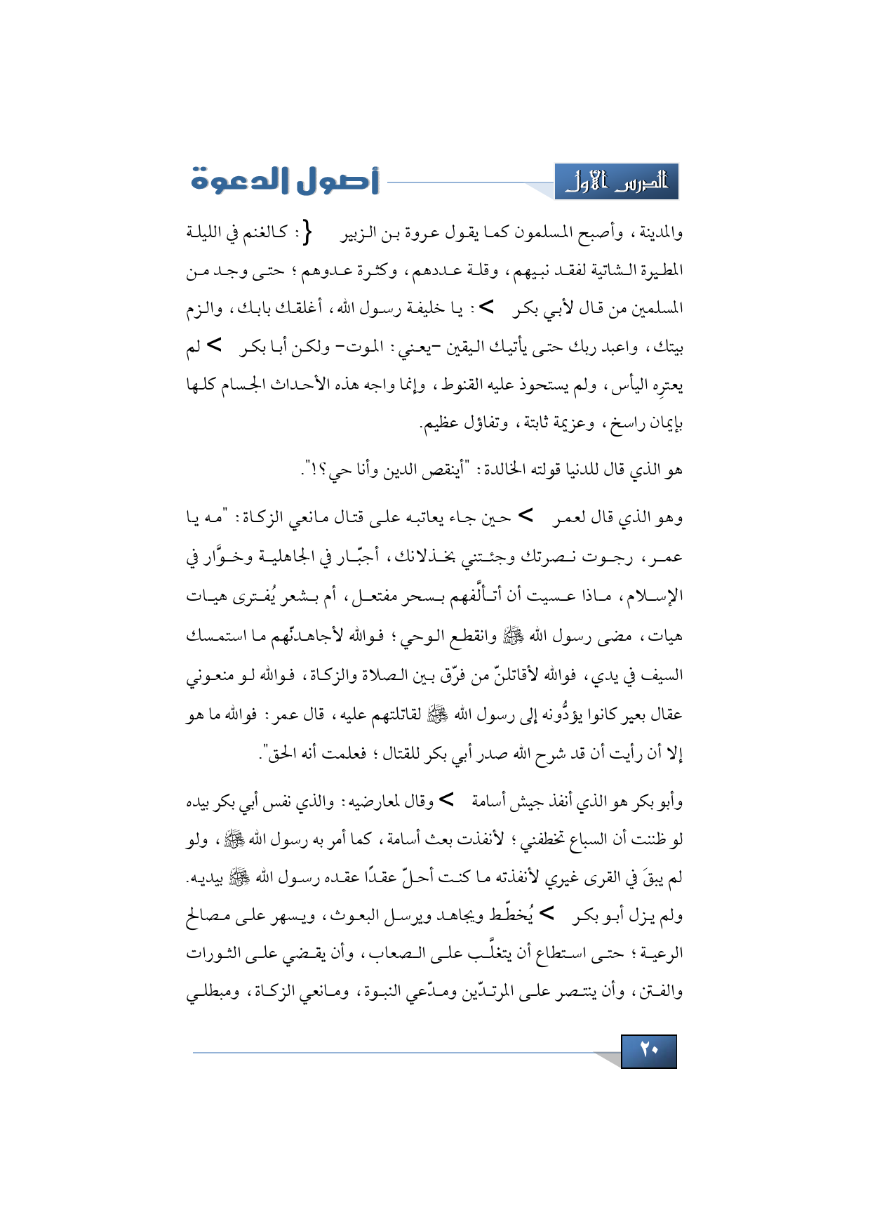 وهو الذي قال لعمر -رضي الله عنه- حين جاء يعاتبه على قتال مانعي الزكاة: "مه يا عمر، رجوت نصرتك وجئتني بخذلانك، أجبّار في الجاهلية وخوَّار في الإسلام، ماذا عسيت أن أتألَّفهم بسحر مفتعل، أم بشعر يُفترى هيات هيات، مضى رسول الله -صلى الله عليه وسلم- وانقطع الوحي؛ فوالله لأجاهدنّهم ما استمسك السيف في يدي، فوالله لأقاتلنّ من فرّق بين الصلاة والزكاة، فوالله لو منعوني عقال بعير كانوا يؤدُّونه إلى رسول الله -صلى الله عليه وسلم- لقاتلتهم عليه، قال عمر: فوالله ما هو إلا أن رأيت أن قد شرح الله صدر أبي بكر للقتال؛ فعلمت أنه الحق".