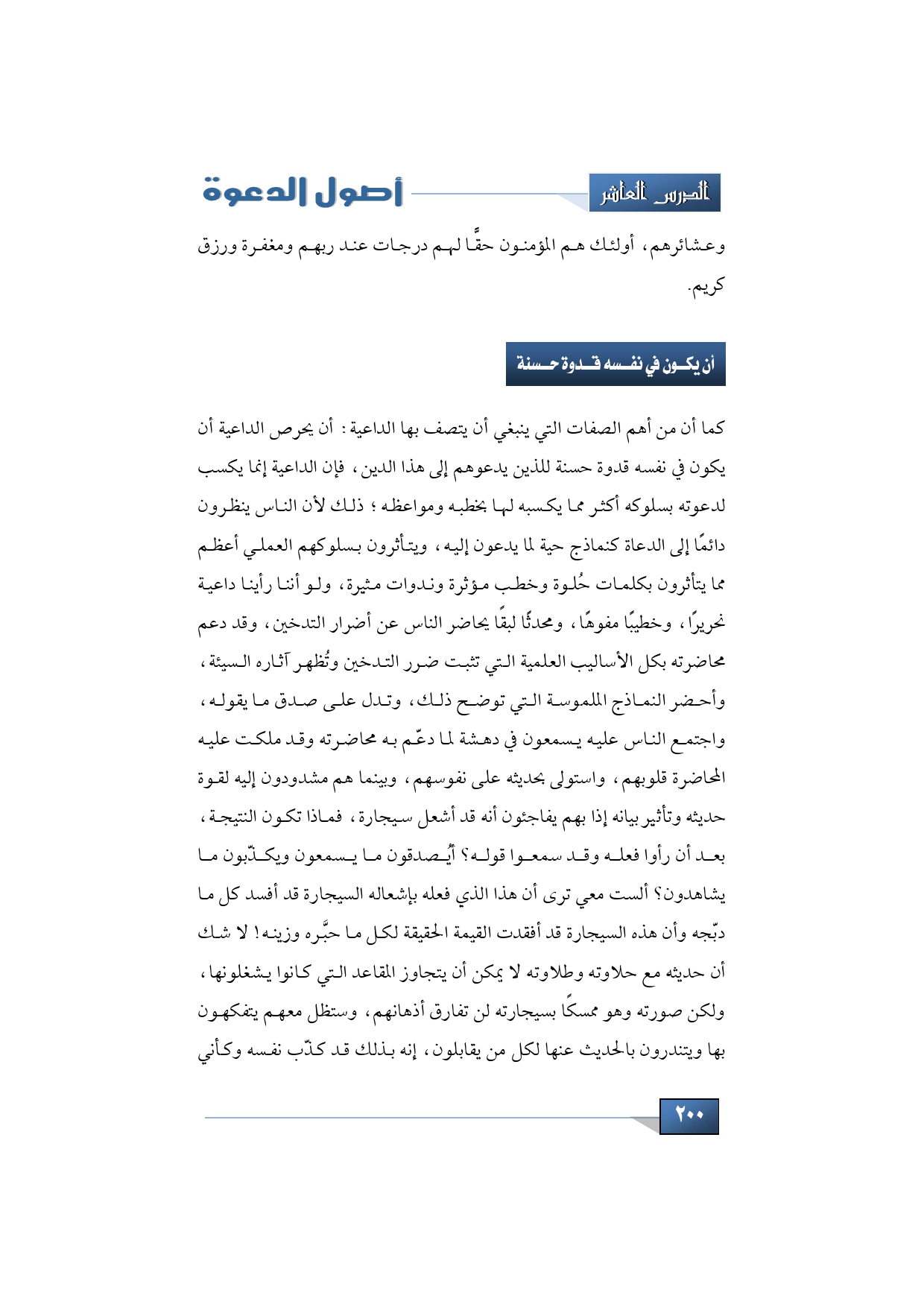 كما أن من أهم الصفات التي ينبغي أن يتصف بها الداعية: أن يحرص الداعية أن يكون في نفسه قدوة حسنة للذين يدعوهم إلى هذا الدين، فإن الداعية إنما يكسب لدعوته بسلوكه أكثر مما يكسبه لها بخطبه ومواعظه؛ ذلك لأن الناس ينظرون دائمًا إلى الدعاة كنماذج حية لما يدعون إليه، ويتأثرون بسلوكهم العملي أعظم مما يتأثرون بكلمات حُلوة وخطب مؤثرة وندوات مثيرة، ولو أننا رأينا داعية نحريرًا، وخطيبًا مفوهًا، ومحدثًا لبقًا يحاضر الناس عن أضرار التدخين، وقد دعم محاضرته بكل الأساليب العلمية التي تثبت ضرر التدخين وتُظهر آثاره السيئة، وأحضر النماذج الملموسة التي توضح ذلك، وتدل على صدق ما يقوله، واجتمع الناس عليه يسمعون في دهشة لما دعّم به محاضرته وقد ملكت عليه المحاضرة قلوبهم، واستولى بحديثه على نفوسهم، وبينما هم مشدودون إليه لقوة حديثه وتأثير بيانه إذا بهم يفاجئون أنه قد أشعل سيجارة، فماذا تكون النتيجة، بعد أن رأوا فعله وقد سمعوا قوله؟ أيُصدقون ما يسمعون ويكذّبون ما يشاهدون؟ ألست معي ترى أن هذا الذي فعله بإشعاله السيجارة قد أفسد كل ما دبّجه وأن هذه السيجارة قد أفقدت القيمة الحقيقة لكل ما حبَّره وزينه! لا شك أن حديثه مع حلاوته وطلاوته لا يمكن أن يتجاوز المقاعد التي كانوا يشغلونها، ولكن صورته وهو ممسكًا بسيجارته لن تفارق أذهانهم، وستظل معهم يتفكهون بها ويتندرون بالحديث عنها لكل من يقابلون، إنه بذلك قد كذّب نفسه وكأني