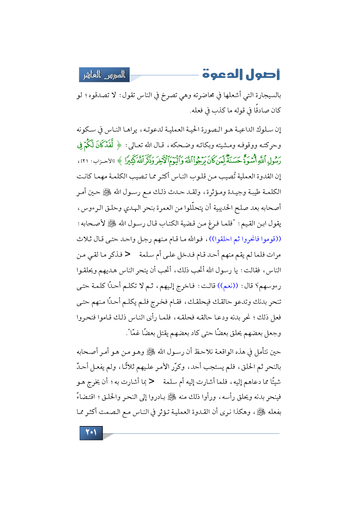 إن سلوك الداعية هو الصورة الحية العملية لدعوته، يراها الناس في سكونه وحركته ووقوفه ومشيته وبكائه وضحكه، قال الله تعالى: {لَقَدْ كَانَ لَكُمْ فِي رَسُولِ اللَّهِ أُسْوَةٌ حَسَنَةٌ لِمَنْ كَانَ يَرْجُو اللَّهَ وَالْيَوْمَ الْآخِرَ وَذَكَرَ اللَّهَ كَثِيرًا} (الأحزاب: 21)، إن القدوة العملية تُصيب من قلوب الناس أكثر مما تصيب الكلمة مهما كانت الكلمة طيبة وجيدة ومؤثرة، ولقد حدث ذلك مع رسول الله -صلى الله عليه وسلم- حين أمر أصحابه بعد صلح الحديبية أن يتحلّلوا من العمرة بنحر الهدي وحلق الرءوس، يقول ابن القيم: "فلما فرغ من قضية الكتاب قال رسول الله -صلى الله عليه وسلم- لأصحابه: ((قوموا فانحروا ثم احلقوا))، فوالله ما قام منهم رجل واحد حتى قال ثلاث مرات فلما لم يقم منهم أحد قام فدخل على أم سلمة -رضي الله عنها- فذكر ما لقي من الناس، فقالت: يا رسول الله أتحب ذلك، أتحب أن ينحر الناس هديهم ويحلقوا رءوسهم؟ قال: ((نعم)) قالت: فاخرج إليهم، ثم لا تكلم أحدًا كلمة حتى تنحر بدنك وتدعو حالقك فيحلقك، فقام فخرج فلم يكلم أحدًا منهم حتى فعل ذلك؛ نحر بدنه ودعا حالقه فحلقه، فلما رأى الناس ذلك قاموا فنحروا وجعل بعضهم يحلق بعضًا حتى كاد بعضهم يقتل بعضًا غمّا".