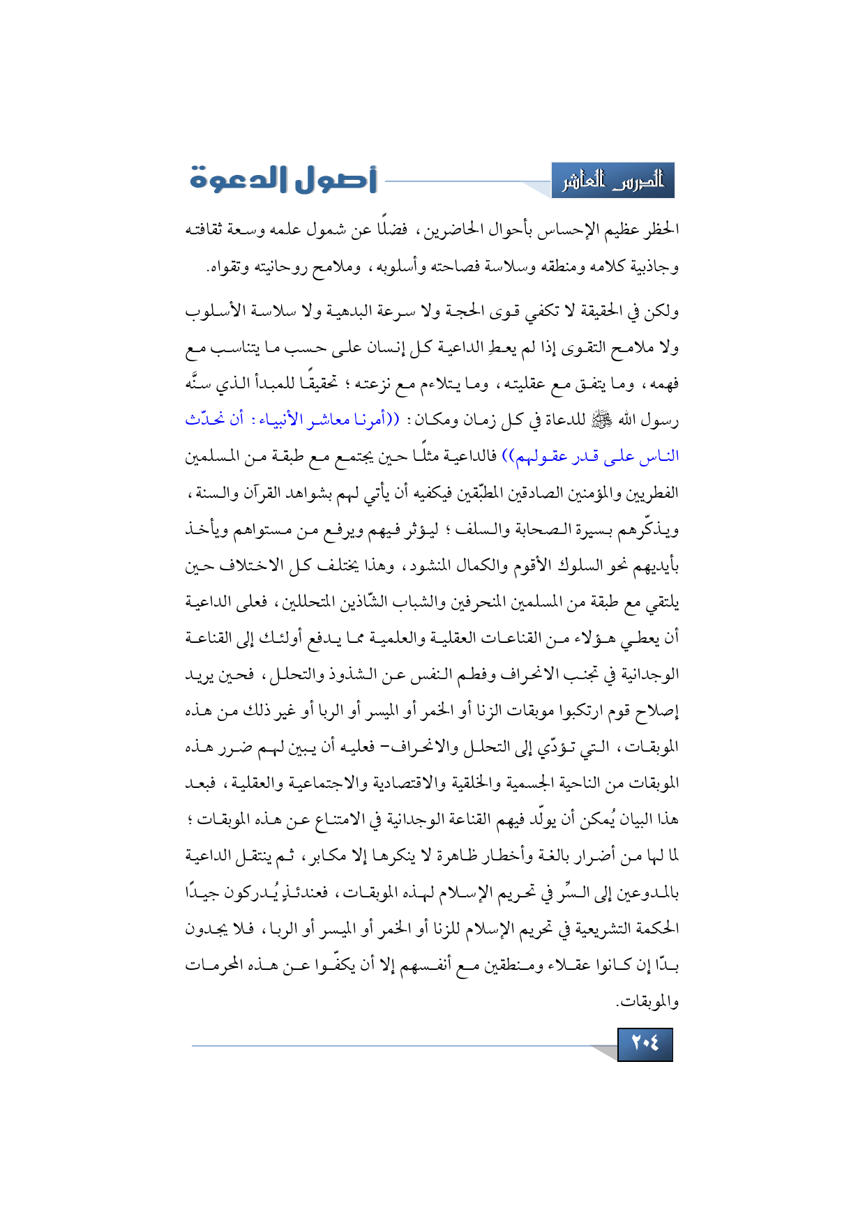 ولكن في الحقيقة لا تكفي قوى الحجة ولا سرعة البدهية ولا سلاسة الأسلوب ولا ملامح التقوى إذا لم يعطِ الداعية كل إنسان على حسب ما يتناسب مع فهمه، وما يتفق مع عقليته، وما يتلاءم مع نزعته؛ تحقيقًا للمبدأ الذي سنَّه رسول الله -صلى الله عليه وسلم- للدعاة في كل زمان ومكان: ((أمرنا معاشر الأنبياء: أن نحدّث الناس على قدر عقولهم)) فالداعية مثلًا حين يجتمع مع طبقة من المسلمين الفطريين والمؤمنين الصادقين المطبّقين فيكفيه أن يأتي لهم بشواهد القرآن والسنة، ويذكّرهم بسيرة الصحابة والسلف؛ ليؤثر فيهم ويرفع من مستواهم ويأخذ بأيديهم نحو السلوك الأقوم والكمال المنشود، وهذا يختلف كل الاختلاف حين يلتقي مع طبقة من المسلمين المنحرفين والشباب الشّاذين المتحللين، فعلى الداعية أن يعطي هؤلاء من القناعات العقلية والعلمية مما يدفع أولئك إلى القناعة الوجدانية في تجنب الانحراف وفطم النفس عن الشذوذ والتحلل، فحين يريد إصلاح قوم ارتكبوا موبقات الزنا أو الخمر أو الميسر أو الربا أو غير ذلك من هذه الموبقات، التي تؤدّي إلى التحلل والانحراف- فعليه أن يبين لهم ضرر هذه الموبقات من الناحية الجسمية والخلقية والاقتصادية والاجتماعية والعقلية، فبعد هذا البيان يُمكن أن يولّد فيهم القناعة الوجدانية في الامتناع عن هذه الموبقات؛ لما لها من أضرار بالغة وأخطار ظاهرة لا ينكرها إلا مكابر، ثم ينتقل الداعية بالمدوعين إلى السِّر في تحريم الإسلام لهذه الموبقات، فعندئذٍ يُدركون جيدًا الحكمة التشريعية في تحريم الإسلام للزنا أو الخمر أو الميسر أو الربا، فلا يجدون بدّا إن كانوا عقلاء ومنطقين مع أنفسهم إلا أن يكفّوا عن هذه المحرمات والموبقات.
