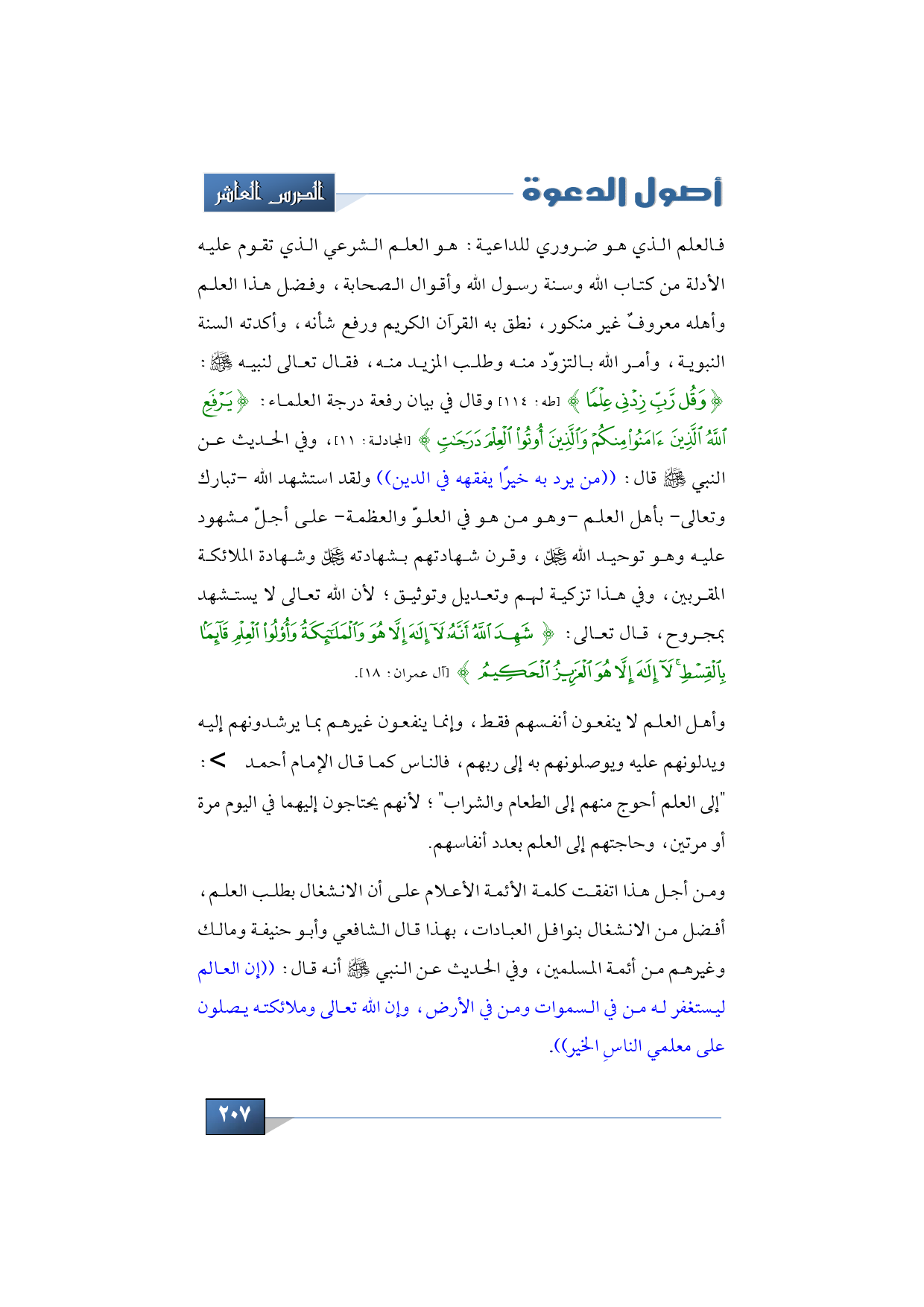 فالعلم الذي هو ضروري للداعية: هو العلم الشرعي الذي تقوم عليه الأدلة من كتاب الله وسنة رسول الله وأقوال الصحابة، وفضل هذا العلم وأهله معروفٌ غير منكور، نطق به القرآن الكريم ورفع شأنه، وأكدته السنة النبوية، وأمر الله بالتزوّد منه وطلب المزيد منه، فقال تعالى لنبيه -صلى الله عليه وسلم-: {وَقُلْ رَبِّ زِدْنِي عِلْمًا} (طه: 114) وقال في بيان رفعة درجة العلماء: {يَرْفَعِ اللَّهُ الَّذِينَ آمَنُوا مِنْكُمْ وَالَّذِينَ أُوتُوا الْعِلْمَ دَرَجَاتٍ} (المجادلة: 11)، وفي الحديث عن النبي -صلى الله عليه وسلم- قال: ((من يرد به خيرًا يفقهه في الدين)) ولقد استشهد الله -تبارك وتعالى- بأهل العلم -وهو من هو في العلوّ والعظمة- على أجلّ مشهود عليه وهو توحيد الله عز وجل، وقرن شهادتهم بشهادته -سبحانه وتعالى- وشهادة الملائكة المقربين، وفي هذا تزكية لهم وتعديل وتوثيق؛ لأن الله تعالى لا يستشهد بمجروح، قال تعالى: {شَهِدَ اللَّهُ أَنَّهُ لَا إِلَهَ إِلَّا هُوَ وَالْمَلَائِكَةُ وَأُولُو الْعِلْمِ قَائِمًا بِالْقِسْطِ لَا إِلَهَ إِلَّا هُوَ الْعَزِيزُ الْحَكِيمُ} (آل عمران: 18).