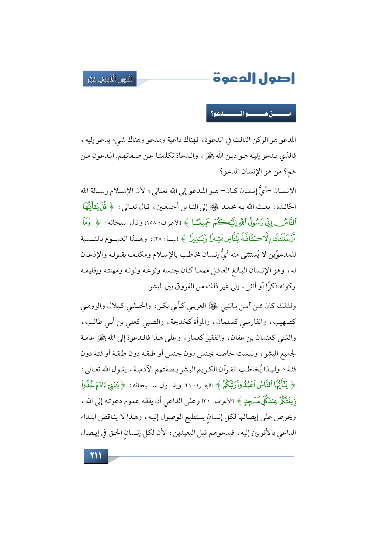ولذلك كان ممن آمن بالنبي -صلى الله عليه وسلم- العربي كأبي بكر، والحبشي كبلال والرومي كصهيب، والفارسي كسلمان، والمرأة كخديجة، والصبي كعلي بن أبي طالب، والغني كعثمان بن عفان، والفقير كعمار، وعلى هذا فالدعوة إلى الله -عز وجل- عامة لجميع البشر، وليست خاصة بجنس دون جنس أو طبقة دون طبقة أو فئة دون فئة؛ ولهذا يُخاطب القرآن الكريم البشر بصفتهم الآدمية، يقول الله تعالى: {يَا أَيُّهَا النَّاسُ اعْبُدُوا رَبَّكُمُ} (البقرة: 21) ويقول سبحانه: {يَا بَنِي آدَمَ خُذُوا زِينَتَكُمْ عِنْدَ كُلِّ مَسْجِدٍ} (الأعراف: 31) وعلى الداعي أن يفقه عموم دعوته إلى الله، ويحرص على إيصالها لكل إنسانٍ يستطيع الوصول إليه، وهذا لا يناقض ابتداء الداعي بالأقربين إليه، فيدعوهم قبل البعيدين؛ لأن لكل إنسانٍ الحق في إيصال