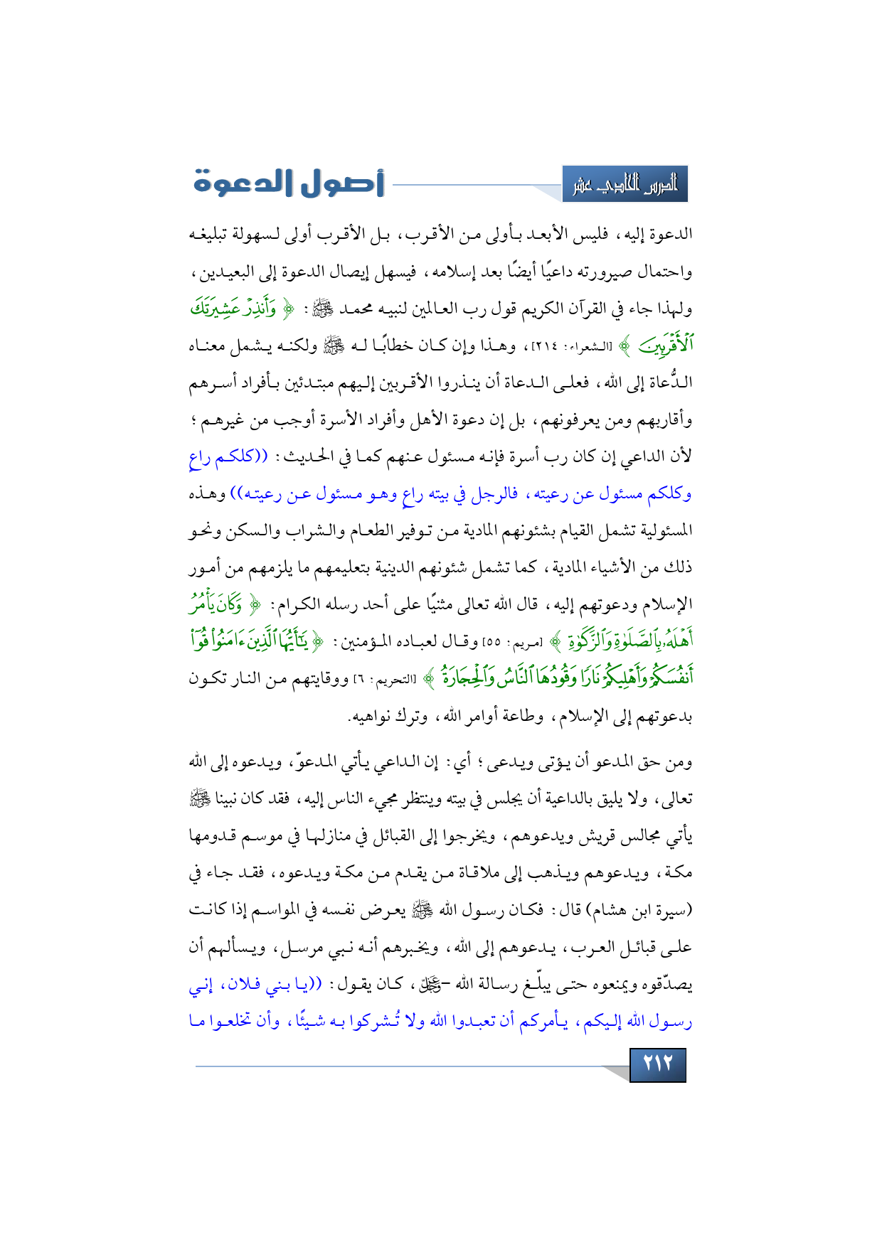 الدعوة إليه، فليس الأبعد بأولى من الأقرب، بل الأقرب أولى لسهولة تبليغه واحتمال صيرورته داعيًا أيضًا بعد إسلامه، فيسهل إيصال الدعوة إلى البعيدين، ولهذا جاء في القرآن الكريم قول رب العالمين لنبيه محمد -صلى الله عليه وسلم-: {وَأَنْذِرْ عَشِيرَتَكَ الْأَقْرَبِينَ} (الشعراء: 214)، وهذا وإن كان خطابًا له -صلى الله عليه وسلم- ولكنه يشمل معناه الدُّعاة إلى الله، فعلى الدعاة أن ينذروا الأقربين إليهم مبتدئين بأفراد أسرهم وأقاربهم ومن يعرفونهم، بل إن دعوة الأهل وأفراد الأسرة أوجب من غيرهم؛ لأن الداعي إن كان رب أسرة فإنه مسئول عنهم كما في الحديث: ((كلكم راعٍ وكلكم مسئول عن رعيته، فالرجل في بيته راعٍ وهو مسئول عن رعيته)) وهذه المسئولية تشمل القيام بشئونهم المادية من توفير الطعام والشراب والسكن ونحو ذلك من الأشياء المادية، كما تشمل شئونهم الدينية بتعليمهم ما يلزمهم من أمور الإسلام ودعوتهم إليه، قال الله تعالى مثنيًا على أحد رسله الكرام: {وَكَانَ يَأْمُرُ أَهْلَهُ بِالصَّلَاةِ وَالزَّكَاةِ} (مريم: 55) وقال لعباده المؤمنين: {يَا أَيُّهَا الَّذِينَ آمَنُوا قُوا أَنْفُسَكُمْ وَأَهْلِيكُمْ نَارًا وَقُودُهَا النَّاسُ وَالْحِجَارَةُ} (التحريم: 6) ووقايتهم من النار تكون بدعوتهم إلى الإسلام، وطاعة أوامر الله، وترك نواهيه.