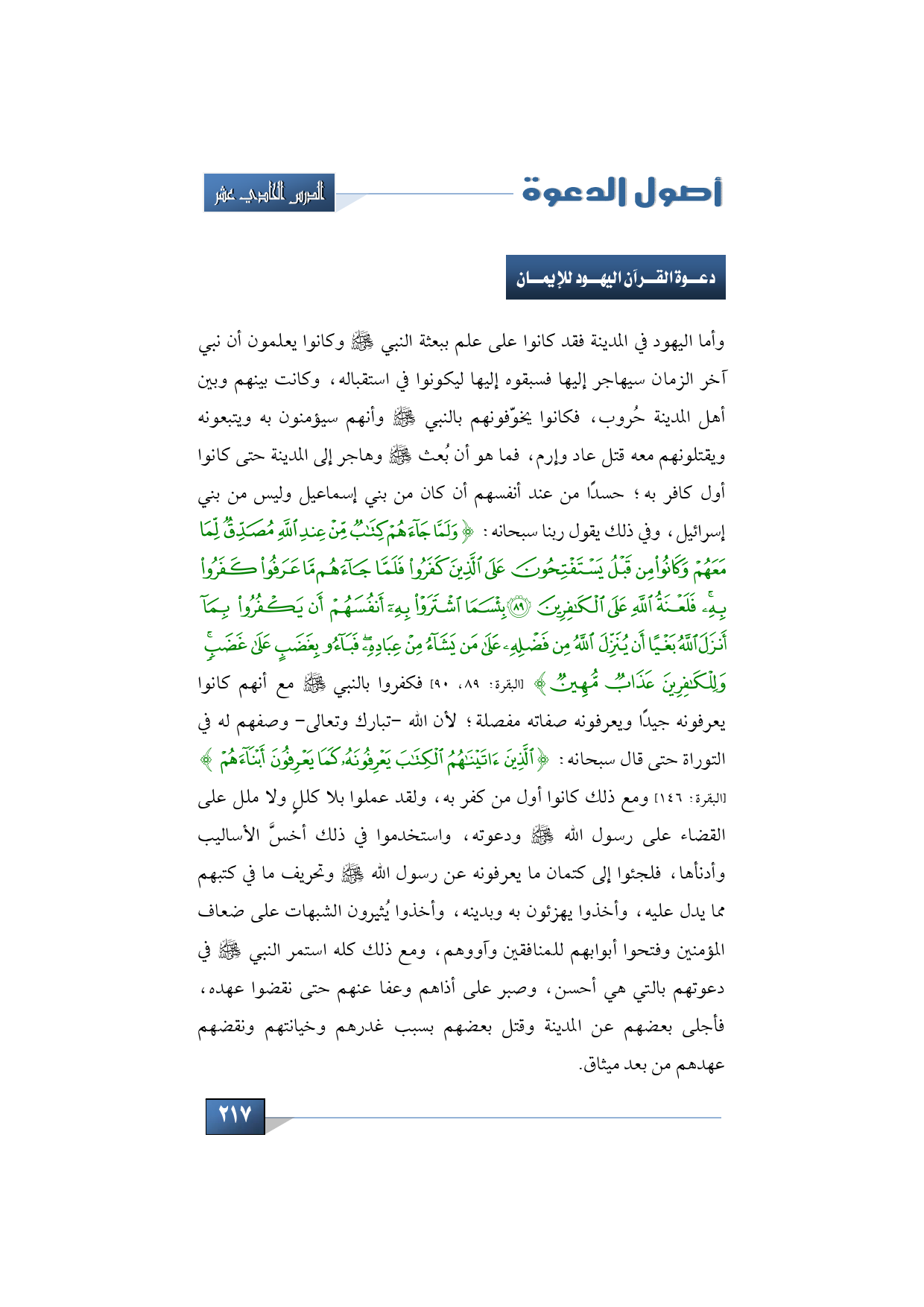 وأما اليهود في المدينة فقد كانوا على علم ببعثة النبي -صلى الله عليه وسلم- وكانوا يعلمون أن نبي آخر الزمان سيهاجر إليها فسبقوه إليها ليكونوا في استقباله، وكانت بينهم وبين أهل المدينة حُروب، فكانوا يخوّفونهم بالنبي -صلى الله عليه وسلم- وأنهم سيؤمنون به ويتبعونه ويقتلونهم معه قتل عاد وإرم، فما هو أن بُعث -صلى الله عليه وسلم- وهاجر إلى المدينة حتى كانوا أول كافر به؛ حسدًا من عند أنفسهم أن كان من بني إسماعيل وليس من بني إسرائيل، وفي ذلك يقول ربنا سبحانه: {وَلَمَّا جَاءَهُمْ كِتَابٌ مِنْ عِنْدِ اللَّهِ مُصَدِّقٌ لِمَا مَعَهُمْ وَكَانُوا مِنْ قَبْلُ يَسْتَفْتِحُونَ عَلَى الَّذِينَ كَفَرُوا فَلَمَّا جَاءَهُمْ مَا عَرَفُوا كَفَرُوا بِهِ فَلَعْنَةُ اللَّهِ عَلَى الْكَافِرِينَ * بِئْسَمَا اشْتَرَوْا بِهِ أَنْفُسَهُمْ أَنْ يَكْفُرُوا بِمَا أَنْزَلَ اللَّهُ بَغْيًا أَنْ يُنَزِّلَ اللَّهُ مِنْ فَضْلِهِ عَلَى مَنْ يَشَاءُ مِنْ عِبَادِهِ فَبَاءُوا بِغَضَبٍ عَلَى غَضَبٍ وَلِلْكَافِرِينَ عَذَابٌ مُهِينٌ} (البقرة: 89، 90) فكفروا بالنبي -صلى الله عليه وسلم- مع أنهم كانوا يعرفونه جيدًا ويعرفونه صفاته مفصلة؛ لأن الله -تبارك وتعالى- وصفهم له في التوراة حتى قال سبحانه: {الَّذِينَ آتَيْنَاهُمُ الْكِتَابَ يَعْرِفُونَهُ كَمَا يَعْرِفُونَ أَبْنَاءَهُمْ} (البقرة: 146) ومع ذلك كانوا أول من كفر به، ولقد عملوا بلا كللٍ ولا ملل على القضاء على رسول الله -صلى الله عليه وسلم- ودعوته، واستخدموا في ذلك أخسَّ الأساليب وأدنأها، فلجئوا إلى كتمان ما يعرفونه عن رسول الله -صلى الله عليه وسلم- وتحريف ما في كتبهم مما يدل عليه، وأخذوا يهزئون به وبدينه، وأخذوا يُثيرون الشبهات على ضعاف المؤمنين وفتحوا أبوابهم للمنافقين وآووهم، ومع ذلك كله استمر النبي -صلى الله عليه وسلم- في دعوتهم بالتي هي أحسن، وصبر على أذاهم وعفا عنهم حتى نقضوا عهده، فأجلى بعضهم عن المدينة وقتل بعضهم بسبب غدرهم وخيانتهم ونقضهم عهدهم من بعد ميثاق.