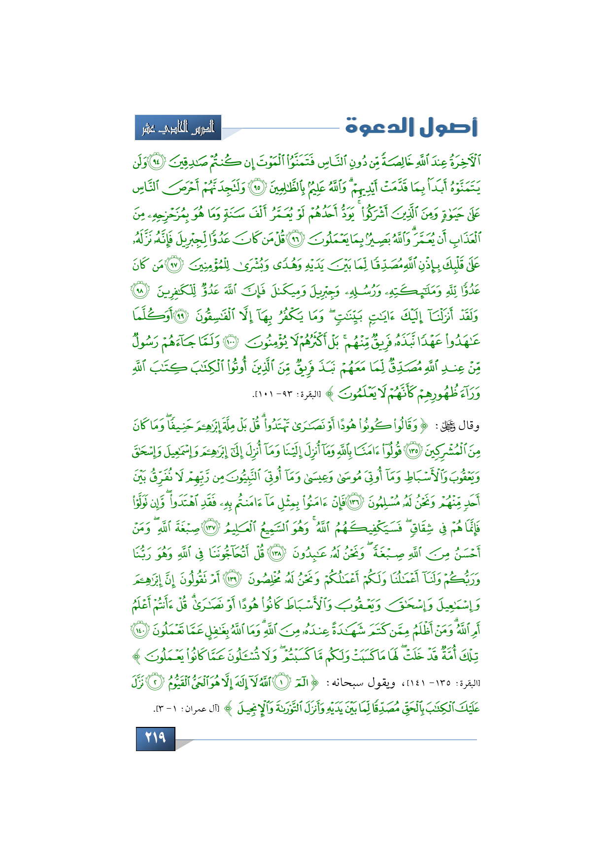 وقال -سبحانه وتعالى-: {وَقَالُوا كُونُوا هُودًا أَوْ نَصَارَى تَهْتَدُوا قُلْ بَلْ مِلَّةَ إِبْرَاهِيمَ حَنِيفًا وَمَا كَانَ مِنَ الْمُشْرِكِينَ * قُولُوا آمَنَّا بِاللَّهِ وَمَا أُنْزِلَ إِلَيْنَا وَمَا أُنْزِلَ إِلَى إِبْرَاهِيمَ وَإِسْمَاعِيلَ وَإِسْحَاقَ وَيَعْقُوبَ وَالْأَسْبَاطِ وَمَا أُوتِيَ مُوسَى وَعِيسَى وَمَا أُوتِيَ النَّبِيُّونَ مِنْ رَبِّهِمْ لَا نُفَرِّقُ بَيْنَ أَحَدٍ مِنْهُمْ وَنَحْنُ لَهُ مُسْلِمُونَ * فَإِنْ آمَنُوا بِمِثْلِ مَا آمَنْتُمْ بِهِ فَقَدِ اهْتَدَوْا وَإِنْ تَوَلَّوْا فَإِنَّمَا هُمْ فِي شِقَاقٍ فَسَيَكْفِيكَهُمُ اللَّهُ وَهُوَ السَّمِيعُ الْعَلِيمُ * صِبْغَةَ اللَّهِ وَمَنْ أَحْسَنُ مِنَ اللَّهِ صِبْغَةً وَنَحْنُ لَهُ عَابِدُونَ * قُلْ أَتُحَاجُّونَنَا فِي اللَّهِ وَهُوَ رَبُّنَا وَرَبُّكُمْ وَلَنَا أَعْمَالُنَا وَلَكُمْ أَعْمَالُكُمْ وَنَحْنُ لَهُ مُخْلِصُونَ * أَمْ تَقُولُونَ إِنَّ إِبْرَاهِيمَ وَإِسْمَاعِيلَ وَإِسْحَاقَ وَيَعْقُوبَ وَالْأَسْبَاطَ كَانُوا هُودًا أَوْ نَصَارَى قُلْ أَأَنْتُمْ أَعْلَمُ أَمِ اللَّهُ وَمَنْ أَظْلَمُ مِمَّنْ كَتَمَ شَهَادَةً عِنْدَهُ مِنَ اللَّهِ وَمَا اللَّهُ بِغَافِلٍ عَمَّا تَعْمَلُونَ * تِلْكَ أُمَّةٌ قَدْ خَلَتْ لَهَا مَا كَسَبَتْ وَلَكُمْ مَا كَسَبْتُمْ وَلَا تُسْأَلُونَ عَمَّا كَانُوا يَعْمَلُونَ} (البقرة: 135 - 141)، ويقول سبحانه: {الم * اللَّهُ لَا إِلَهَ إِلَّا هُوَ الْحَيُّ الْقَيُّومُ * نَزَّلَ عَلَيْكَ الْكِتَابَ بِالْحَقِّ} (آل عمران: 1 - 3).