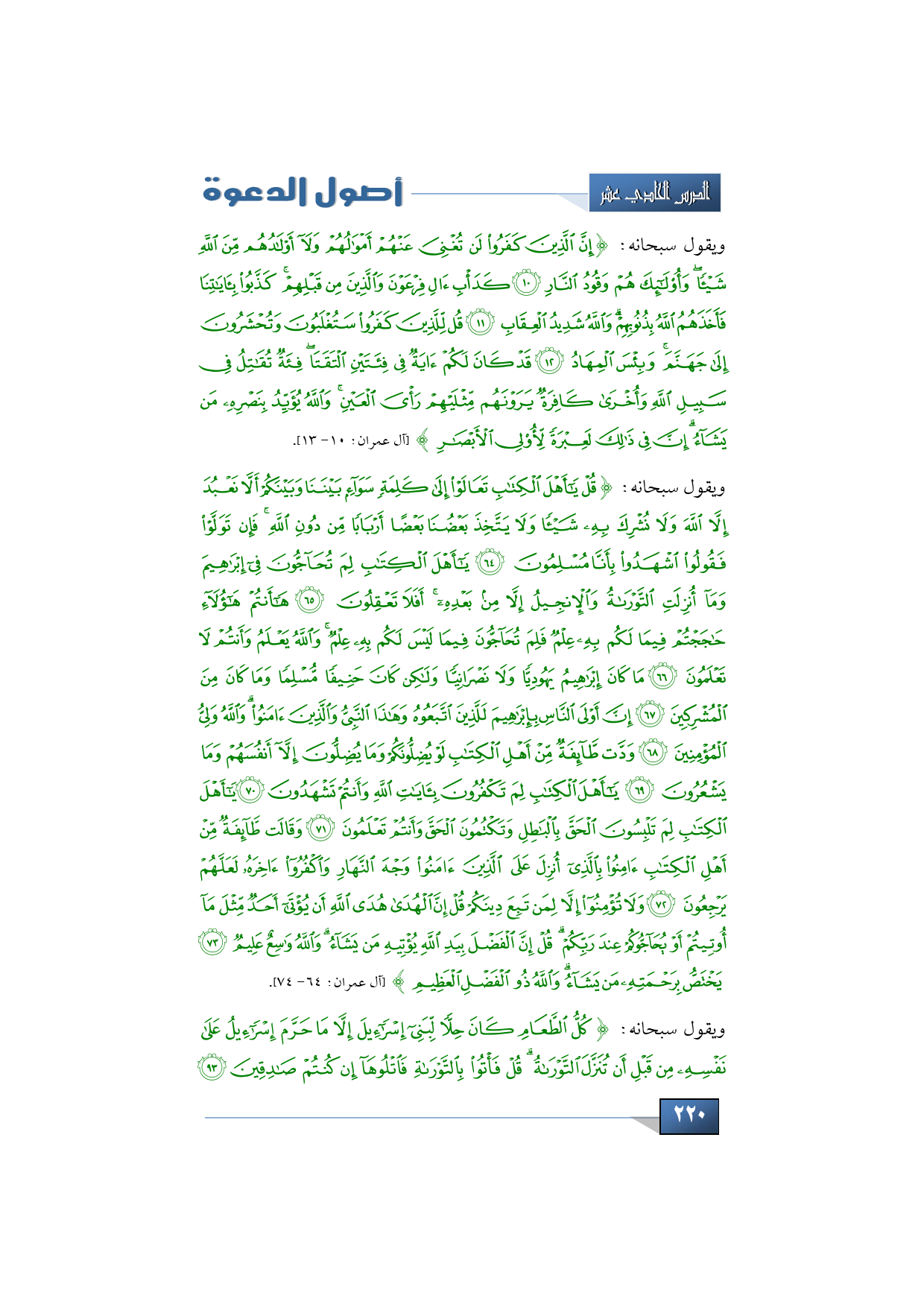 ويقول سبحانه: {قُلْ يَا أَهْل الْكِتَابِ تَعَالَوْا إِلَى كَلِمَةٍ سَوَاءٍ بَيْنَنَا وَبَيْنَكُمْ أَلَّا نَعْبُدَ إِلَّا اللَّهَ وَلَا نُشْرِكَ بِهِ شيئًا وَلَا يَتَّخِذَ بَعْضُنَا بَعْضًا أَرْبَابًا مِنْ دُونِ اللَّهِ فَإِنْ تَوَلَّوْا فَقُولُوا اشْهَدُوا بِأَنَّا مُسْلِمُونَ * يَا أَهْل الْكِتَابِ لِمَ تُحَاجُّونَ فِي إِبْرَاهِيمَ وَمَا أُنْزِلَتِ التَّوْرَاةُ وَالْإِنْجِيلُ إِلَّا مِنْ بَعْدِهِ أَفَلَا تَعْقِلُونَ * هَا أَنْتُمْ هَؤُلَاءِ حَاجَجْتُمْ فِيمَا لَكُمْ بِهِ عِلْمٌ فَلِمَ تُحَاجُّونَ فِيمَا لَيْسَ لَكُمْ بِهِ عِلْمٌ وَاللَّهُ يَعْلَمُ وَأَنْتُمْ لَا تَعْلَمُونَ * مَا كَانَ إِبْرَاهِيمُ يَهُودِيًّا وَلَا نَصْرَانِيًّا وَلَكِنْ كَانَ حَنِيفًا مُسْلِمًا وَمَا كَانَ مِنَ الْمُشْرِكِينَ * إِنَّ أَوْلَى النَّاسِ بِإِبْرَاهِيمَ لَلَّذِينَ اتَّبَعُوهُ وَهَذَا النَّبِيُّ وَالَّذِينَ آمَنُوا وَاللَّهُ وَلِيُّ الْمُؤْمِنِينَ * وَدَّتْ طَائِفَةٌ مِنْ أَهْلِ الْكِتَابِ لَوْ يُضِلُّونَكُمْ وَمَا يُضِلُّونَ إِلَّا أَنْفُسَهُمْ وَمَا يَشْعُرُونَ * يَا أَهْل الْكِتَابِ لِمَ تَكْفُرُونَ بِآيَاتِ اللَّهِ وَأَنْتُمْ تَشْهَدُونَ * يَا أَهْل الْكِتَابِ لِمَ تَلْبِسُونَ الْحَقَّ بِالْبَاطِلِ وَتَكْتُمُونَ الْحَقَّ وَأَنْتُمْ تَعْلَمُونَ * وَقَالَتْ طَائِفَةٌ مِنْ أَهْلِ الْكِتَابِ آمِنُوا بِالَّذِي أُنْزِلَ عَلَى الَّذِينَ آمَنُوا وَجْهَ النَّهَارِ وَاكْفُرُوا آخِرَهُ لَعَلَّهُمْ يَرْجِعُونَ * وَلَا تُؤْمِنُوا إِلَّا لِمَنْ تَبِعَ دِينَكُمْ قُلْ إِنَّ الْهُدَى هُدَى اللَّهِ أَنْ يُؤْتَى أَحَدٌ مِثْلَ مَا أُوتِيتُمْ أَوْ يُحَاجُّوكُمْ عِنْدَ رَبِّكُمْ قُلْ إِنَّ الْفَضْلَ بِيَدِ اللَّهِ يُؤْتِيهِ مَنْ يَشَاءُ وَاللَّهُ وَاسِعٌ عَلِيمٌ * يَخْتَصُّ بِرَحْمَتِهِ مَنْ يَشَاءُ وَاللَّهُ ذُو الْفَضْلِ الْعَظِيمِ} (آل عمران: 64 - 74).