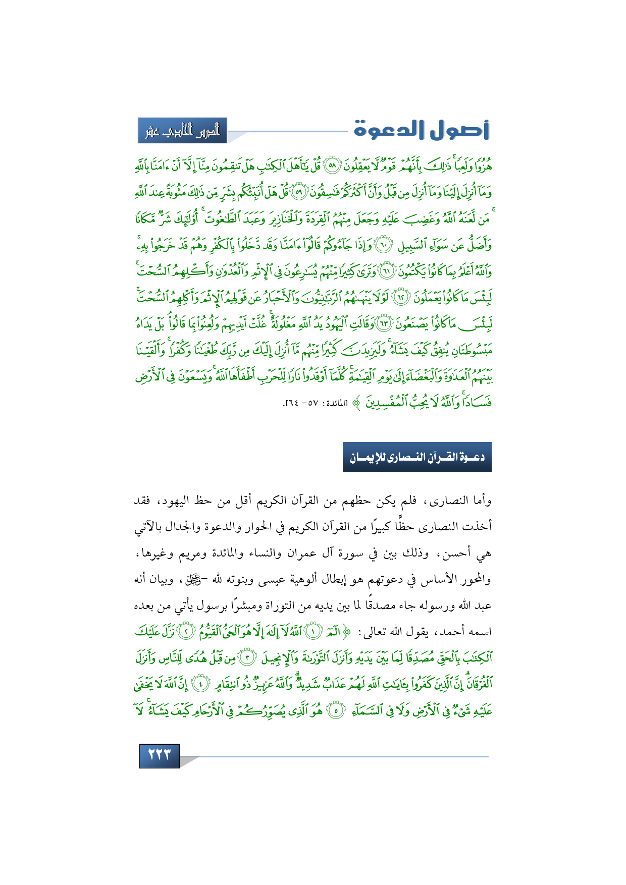 وأما النصارى، فلم يكن حظهم من القرآن الكريم أقل من حظ اليهود، فقد أخذت النصارى حظًّا كبيرًا من القرآن الكريم في الحوار والدعوة والجدال بالآتي هي أحسن، وذلك بين في سورة آل عمران والنساء والمائدة ومريم وغيرها، والمحور الأساس في دعوتهم هو إبطال ألوهية عيسى وبنوته لله -عز وجل، وبيان أنه عبد الله ورسوله جاء مصدقًا لما بين يديه من التوراة ومبشرًا برسول يأتي من بعده اسمه أحمد، يقول الله تعالى: {الم * اللَّهُ لَا إِلَهَ إِلَّا هُوَ الْحَيُّ الْقَيُّومُ * نَزَّلَ عَلَيْكَ الْكِتَابَ بِالْحَقِّ مُصَدِّقًا لِمَا بَيْنَ يَدَيْهِ وَأَنْزَلَ التَّوْرَاةَ وَالْإِنْجِيلَ * مِنْ قَبْلُ هُدًى لِلنَّاسِ وَأَنْزَلَ الْفُرْقَانَ إِنَّ الَّذِينَ كَفَرُوا بِآيَاتِ اللَّهِ لَهُمْ عَذَابٌ شَدِيدٌ وَاللَّهُ عَزِيزٌ ذُو انْتِقَامٍ * إِنَّ اللَّهَ لَا يَخْفَى عَلَيْهِ شَيْءٌ فِي الْأَرْضِ وَلَا فِي السَّمَاءِ * هُوَ الَّذِي يُصَوِّرُكُمْ فِي الْأَرْحَامِ كَيْفَ يَشَاءُ لَا