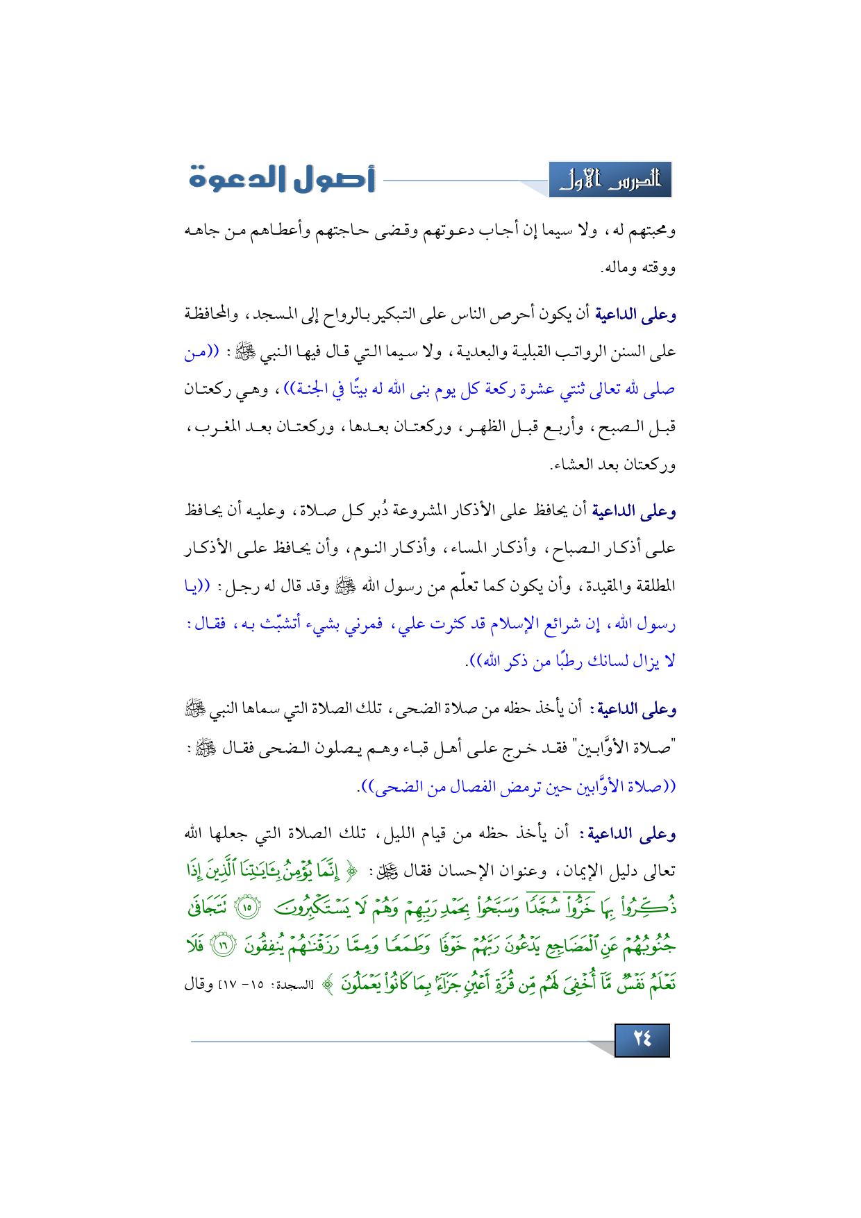 وعلى الداعية أن يكون أحرص الناس على التبكير بالرواح إلى المسجد، والمحافظة على السنن الرواتب القبلية والبعدية، ولا سيما التي قال فيها النبي -صلى الله عليه وسلم-: ((من صلى لله تعالى ثنتي عشرة ركعة كل يوم بنى الله له بيتًا في الجنة))، وهي ركعتان قبل الصبح، وأربع قبل الظهر، وركعتان بعدها، وركعتان بعد المغرب، وركعتان بعد العشاء، وعلى الداعية أن يحافظ على الأذكار المشروعة دُبر كل صلاة، وعليه أن يحافظ على أذكار الصباح، وأذكار المساء، وأذكار النوم، وأن يحافظ على الأذكار المطلقة والمقيدة، وأن يكون كما تعلّم من رسول الله -صلى الله عليه وسلم- وقد قال له رجل: ((يا رسول الله، إن شرائع الإسلام قد كثرت علي، فمرني بشيء أتشبّث به، فقال: لا يزال لسانك رطبًا من ذكر الله)).