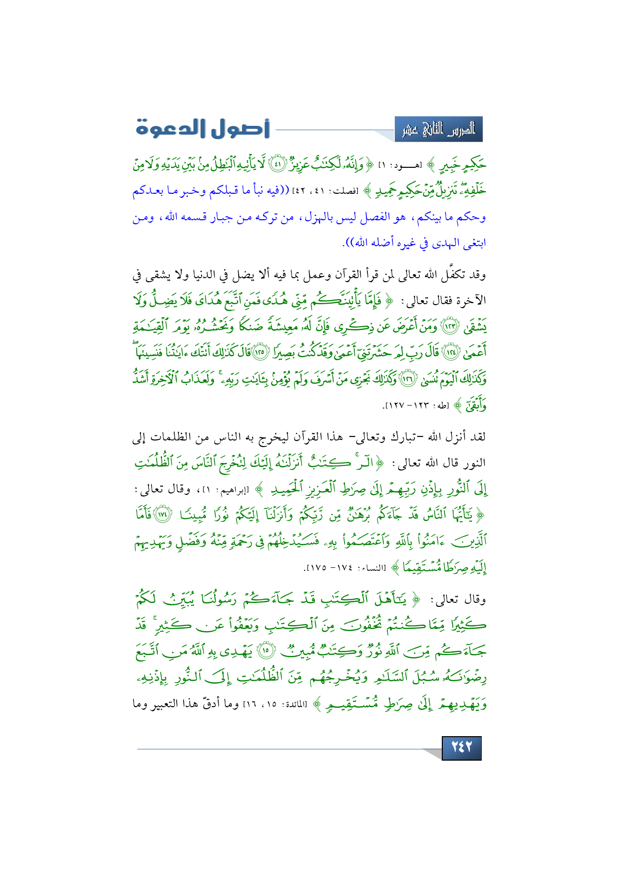 حَكِيمٍ خَبِيرٍ} (هود: 1) {وَإِنَّهُ لَكِتَابٌ عَزِيزٌ * لَا يَأْتِيهِ الْبَاطِلُ مِنْ بَيْنِ يَدَيْهِ وَلَا مِنْ خَلْفِهِ تَنْزِيلٌ مِنْ حَكِيمٍ حَمِيدٍ} (فصلت: 41، 42) ((فيه نبأ ما قبلكم وخبر ما بعدكم وحكم ما بينكم، هو الفصل ليس بالهزل، من تركه من جبار قسمه الله، ومن ابتغى الهدى في غيره أضله الله)).