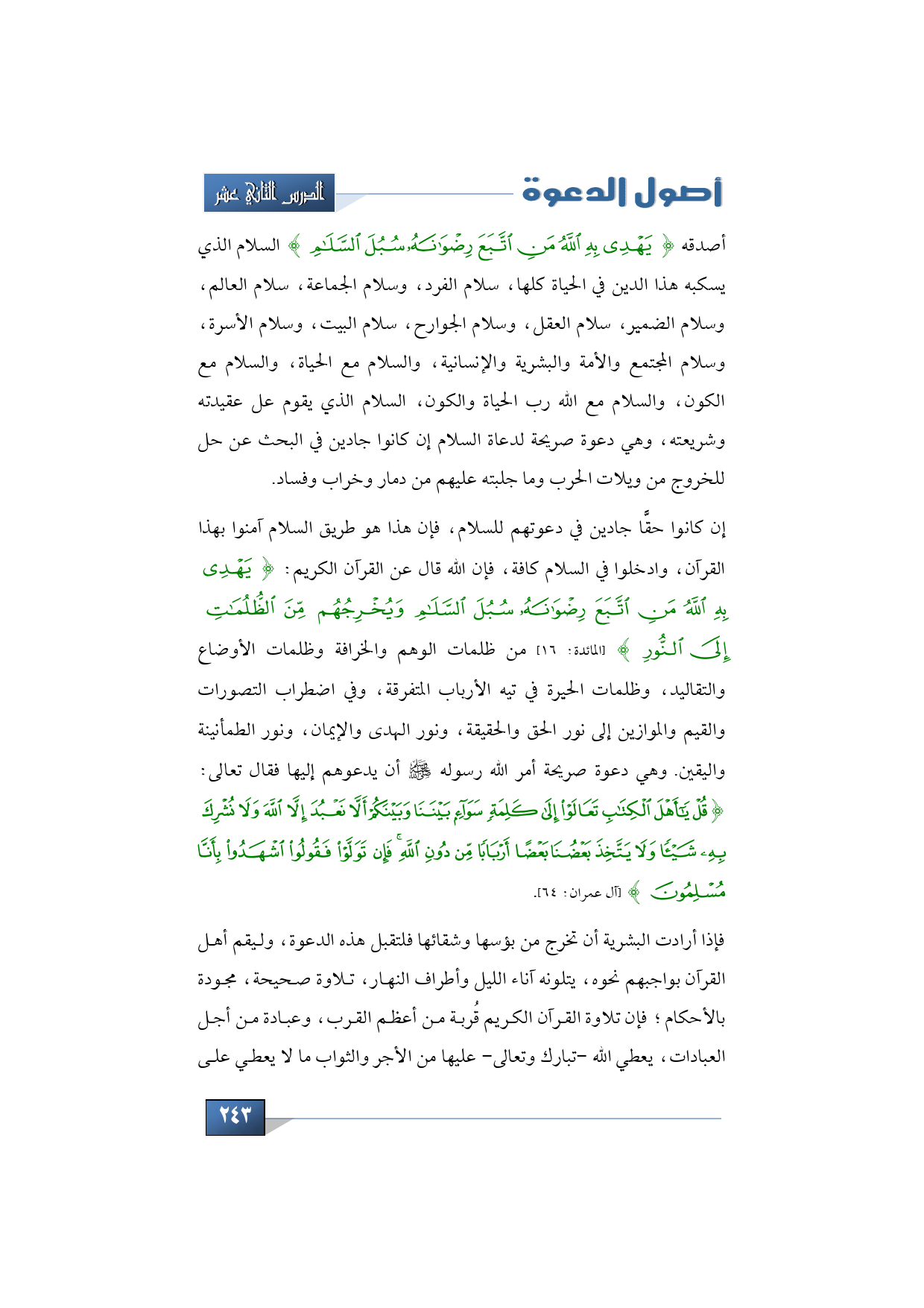 أصدقه {يَهْدِي بِهِ اللَّهُ مَنِ اتَّبَعَ رِضْوَانَهُ سُبُلَ السَّلَامِ} السلام الذي يسكبه هذا الدين في الحياة كلها، سلام الفرد، وسلام الجماعة، سلام العالم، وسلام الضمير، سلام العقل، وسلام الجوارح، سلام البيت، وسلام الأسرة، وسلام المجتمع والأمة والبشرية والإنسانية، والسلام مع الحياة، والسلام مع الكون، والسلام مع الله رب الحياة والكون، السلام الذي يقوم عل عقيدته وشريعته، وهي دعوة صريحة لدعاة السلام إن كانوا جادين في البحث عن حل للخروج من ويلات الحرب وما جلبته عليهم من دمار وخراب وفساد.