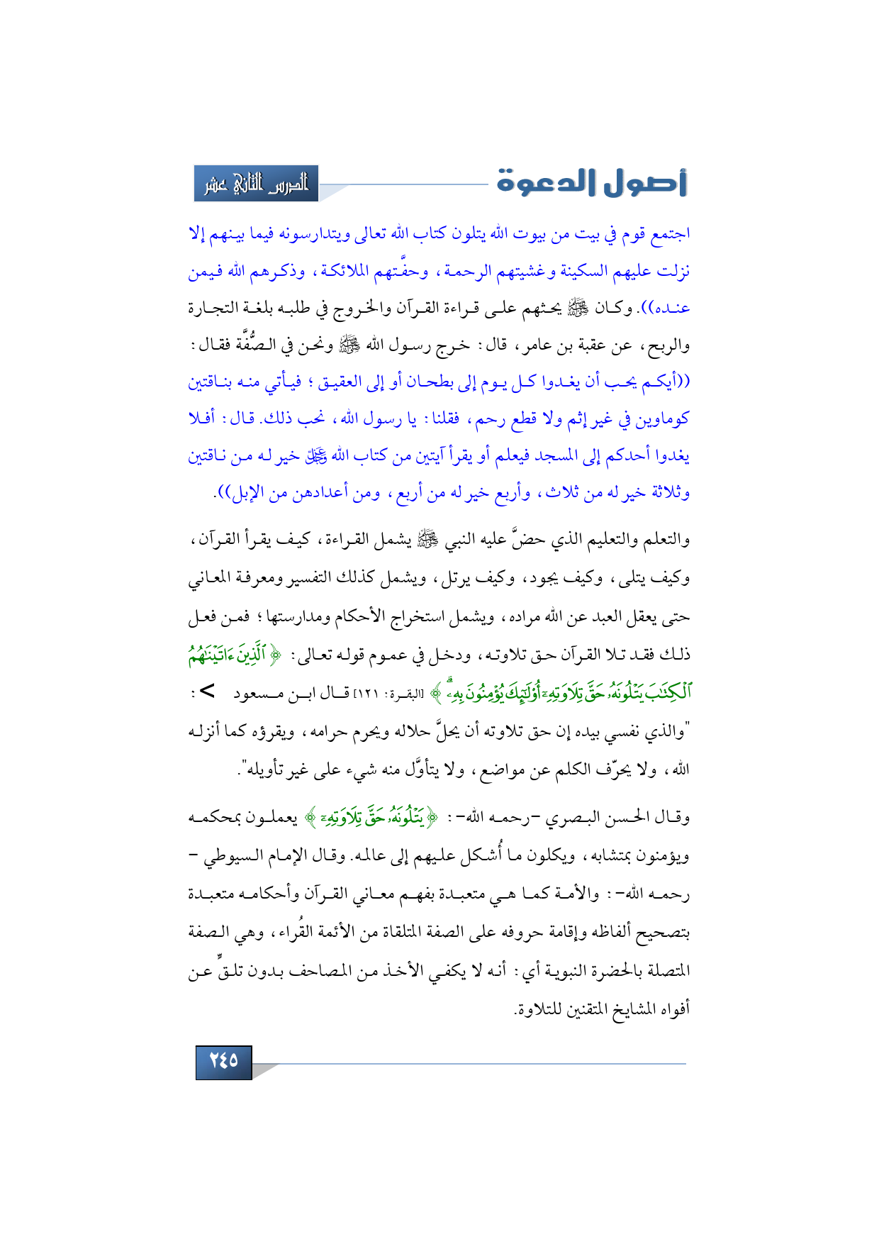 وقال الحسن البصري -رحمه الله-: {يَتْلُونَهُ حَقَّ تِلَاوَتِه} يعملون بمحكمه ويؤمنون بمتشابه، ويكلون ما أُشكل عليهم إلى عالمه. وقال الإمام السيوطي -رحمه الله-: والأمة كما هي متعبدة بفهم معاني القرآن وأحكامه متعبدة بتصحيح ألفاظه وإقامة حروفه على الصفة المتلقاة من الأئمة القُراء، وهي الصفة المتصلة بالحضرة النبوية أي: أنه لا يكفي الأخذ من المصاحف بدون تلقٍّ عن أفواه المشايخ المتقنين للتلاوة.