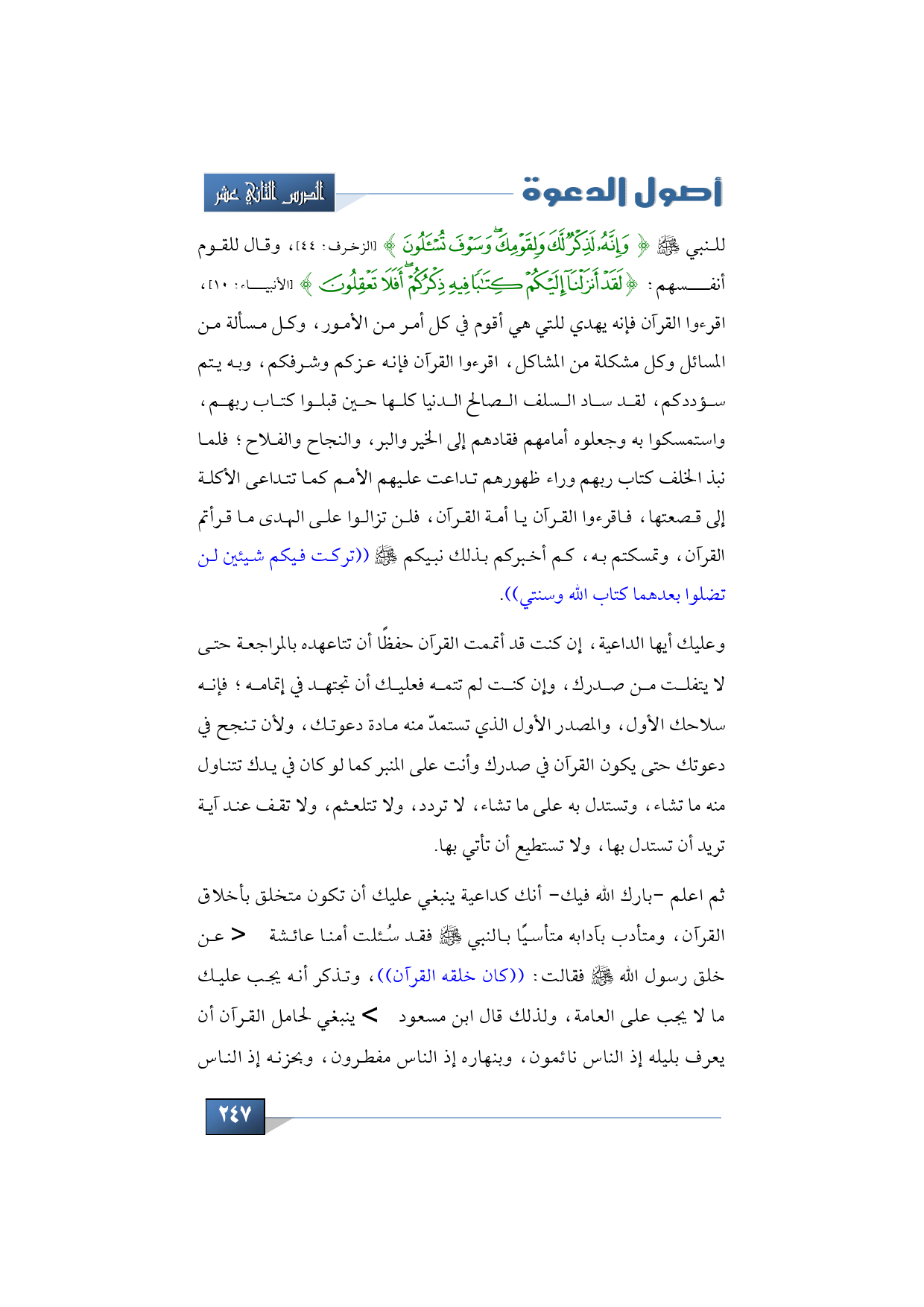 ثم اعلم -بارك الله فيك- أنك كداعية ينبغي عليك أن تكون متخلق بأخلاق القرآن، ومتأدب بآدابه متأسيًا بالنبي -صلى الله عليه وسلم- فقد سُئلت أمنا عائشة -رضي الله عنها- عن خلق رسول الله -صلى الله عليه وسلم- فقالت: ((كان خلقه القرآن))، وتذكر أنه يجب عليك ما لا يجب على العامة، ولذلك قال ابن مسعود -رضي الله عنه- ينبغي لحامل القرآن أن يعرف بليله إذ الناس نائمون، وبنهاره إذ الناس مفطرون، وبحزنه إذ الناس
