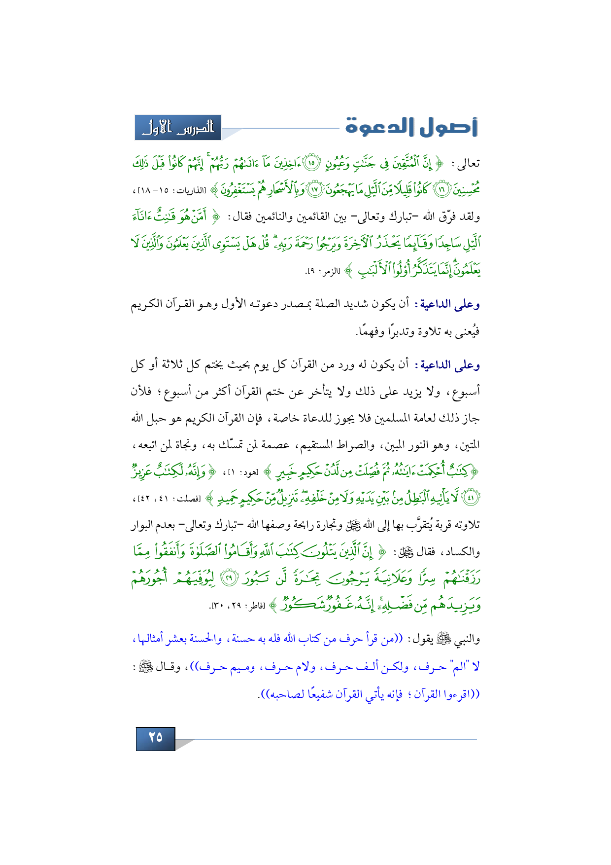 وعلى الداعية أن يكون شديد الصلة بمصدر دعوته الأول وهو القرآن الكريم فيُعنى به تلاوة وتدبرًا وفهمًا، وعلى الداعية أن يكون له ورد من القرآن كل يوم بحيث يختم كل ثلاثة أو كل أسبوع، ولا يزيد على ذلك ولا يتأخر عن ختم القرآن أكثر من أسبوع؛ فلأن جاز ذلك لعامة المسلمين فلا يجوز للدعاة خاصة، فإن القرآن الكريم هو حبل الله المتين، وهو النور المبين، والصراط المستقيم، عصمة لمن تمسّك به، ونجاة لمن اتبعه، {كِتَابٌ أُحْكِمَتْ آيَاتُهُ ثُمَّ فُصِّلَتْ مِنْ لَدُنْ حَكِيمٍ خَبِيرٍ} (هود: 1)، {وَإِنَّهُ لَكِتَابٌ عَزِيزٌ * لَا يَأْتِيهِ الْبَاطِلُ مِنْ بَيْنِ يَدَيْهِ وَلَا مِنْ خَلْفِهِ تَنْزِيلٌ مِنْ حَكِيمٍ حَمِيدٍ} (فصلت: 41، 42)، تلاوته قربة يُتقرَّب بها إلى الله -سبحانه وتعالى- وتجارة رابحة وصفها الله -تبارك وتعالى- بعدم البوار والكساد، فقال -عز وجل-: {إِنَّ الَّذِينَ يَتْلُونَ كِتَابَ اللَّهِ وَأَقَامُوا الصَّلَاةَ وَأَنْفَقُوا مِمَّا رَزَقْنَاهُمْ سِرًّا وَعَلَانِيَةً يَرْجُونَ تِجَارَةً لَنْ تَبُورَ * لِيُوَفِّيَهُمْ أُجُورَهُمْ وَيَزِيدَهُمْ مِنْ فَضْلِهِ إِنَّهُ غَفُورٌ شَكُورٌ} (فاطر: 29، 30).