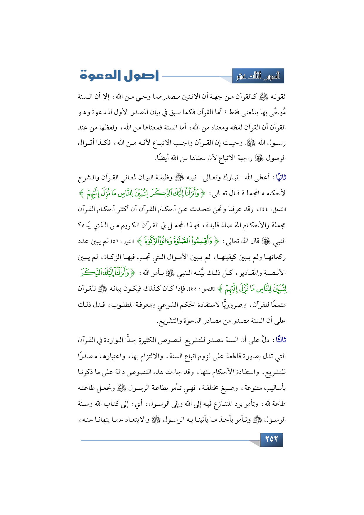 ثانيًا: أعطى الله -تبارك وتعالى- نبيه -صلى الله عليه وسلم- وظيفة البيان لمعاني القرآن والشرح لأحكامه المجملة قال تعالى: {وَأَنْزَلْنَا إِلَيْكَ الذِّكْرَ لِتُبَيِّنَ لِلنَّاسِ مَا نُزِّلَ إِلَيْهِمْ} (النحل: 44)، وقد عرفنا ونحن نتحدث عن أحكام القرآن أن أكثر أحكام القرآن مجملة والأحكام المفصلة قليلة، فهذا المجمل في القرآن الكريم من الذي بيّنه؟ النبي -صلى الله عليه وسلم- قال الله تعالى: {وَأَقِيمُوا الصَّلَاةَ وَآتُوا الزَّكَاةَ} (النور: 56) لم يبين عدد ركعاتها ولم يبين كيفيتها، لم يبين الأموال التي تجب فيها الزكاة، لم يبين الأنصبة والمقادير، كل ذلك بيَّنه النبي -صلى الله عليه وسلم- بأمر الله: {وَأَنْزَلْنَا إِلَيْكَ الذِّكْرَ لِتُبَيِّنَ لِلنَّاسِ مَا نُزِّلَ إِلَيْهِمْ} (النحل: 44). فإذا كان كذلك فيكون بيانه -صلى الله عليه وسلم- للقرآن متممًا للقرآن، وضروريًّا لاستفادة الحكم الشرعي ومعرفة المطلوب، فدل ذلك على أن السنة مصدر من مصادر الدعوة والتشريع.