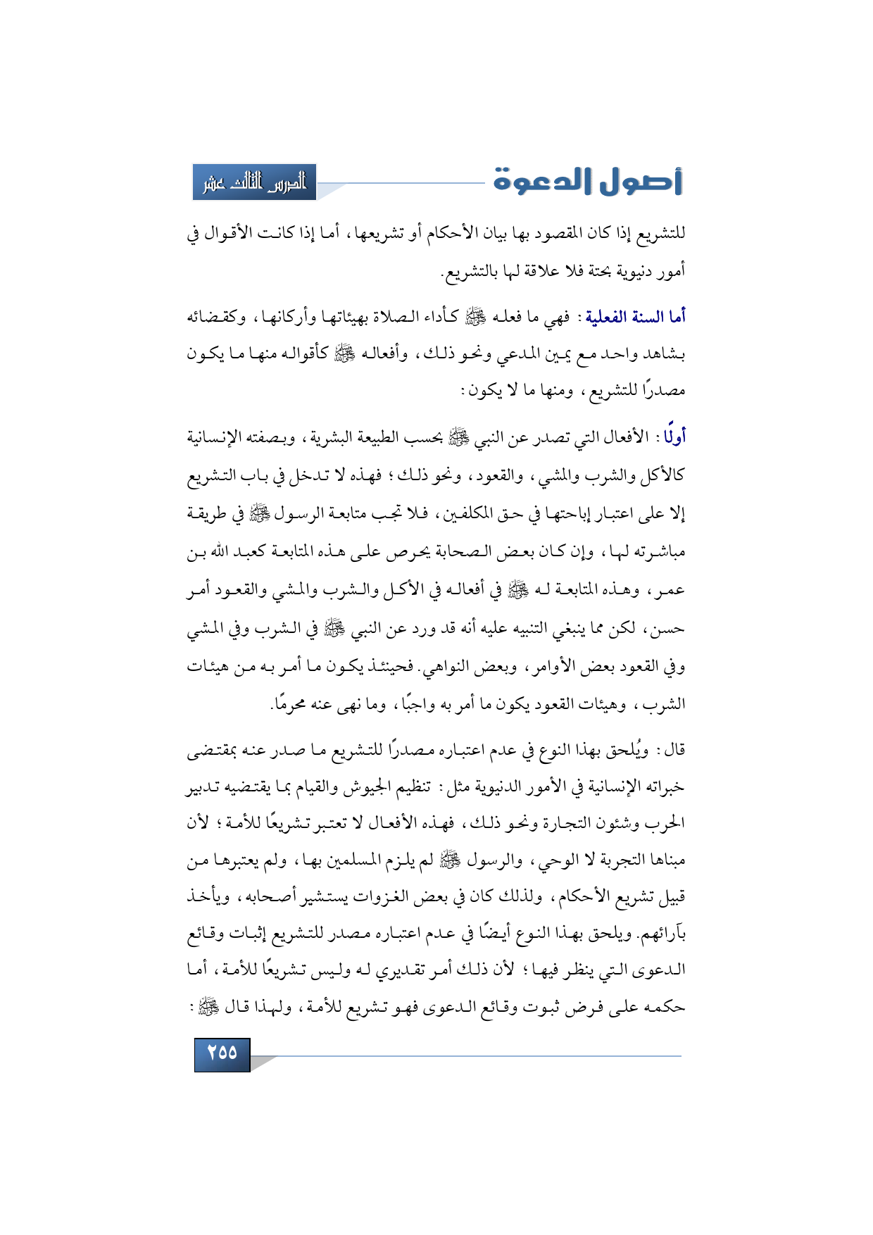 قال: ويُلحق بهذا النوع في عدم اعتباره مصدرًا للتشريع ما صدر عنه بمقتضى خبراته الإنسانية في الأمور الدنيوية مثل: تنظيم الجيوش والقيام بما يقتضيه تدبير الحرب وشئون التجارة ونحو ذلك، فهذه الأفعال لا تعتبر تشريعًا للأمة؛ لأن مبناها التجربة لا الوحي، والرسول -صلى الله عليه وسلم- لم يلزم المسلمين بها، ولم يعتبرها من قبيل تشريع الأحكام، ولذلك كان في بعض الغزوات يستشير أصحابه، ويأخذ بآرائهم. ويلحق بهذا النوع أيضًا في عدم اعتباره مصدر للتشريع إثبات وقائع الدعوى التي ينظر فيها؛ لأن ذلك أمر تقديري له وليس تشريعًا للأمة، أما حكمه على فرض ثبوت وقائع الدعوى فهو تشريع للأمة، ولهذا قال -صلى الله عليه وسلم-: