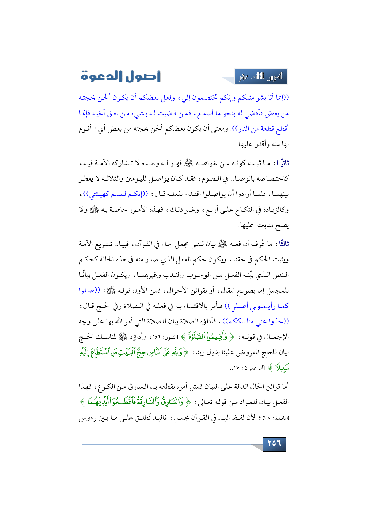 ثالثًا: ما عُرف أن فعله -صلى الله عليه وسلم- بيان لنص مجمل جاء في القرآن، فبيان تشريع الأمة ويثبت الحكم في حقنا، ويكون حكم الفعل الذي صدر منه في هذه الحالة كحكم النص الذي بيّنه الفعل من الوجوب والندب وغيرهما، ويكون الفعل بيانًا للمجمل إما بصريح المقال، أو بقرائن الأحوال، فمن الأول قوله -صلى الله عليه وسلم-: ((صلوا كما رأيتموني أصلي)) فأمر بالاقتداء به في فعله في الصلاة وفي الحج قال: ((خذوا عني مناسككم))، فأداؤه الصلاة بيان للصلاة التي أمر الله بها على وجه الإجمال في قوله: {وَأَقِيمُوا الصَّلَاةَ} (النور: 56)، وأداؤه -صلى الله عليه وسلم- لمناسك الحج بيان للحج المفروض علينا بقول ربنا: {وَلِلَّهِ عَلَى النَّاسِ حِجُّ الْبَيْتِ مَنِ اسْتَطَاعَ إِلَيْهِ سَبِيلًا} (آل عمران: 97).