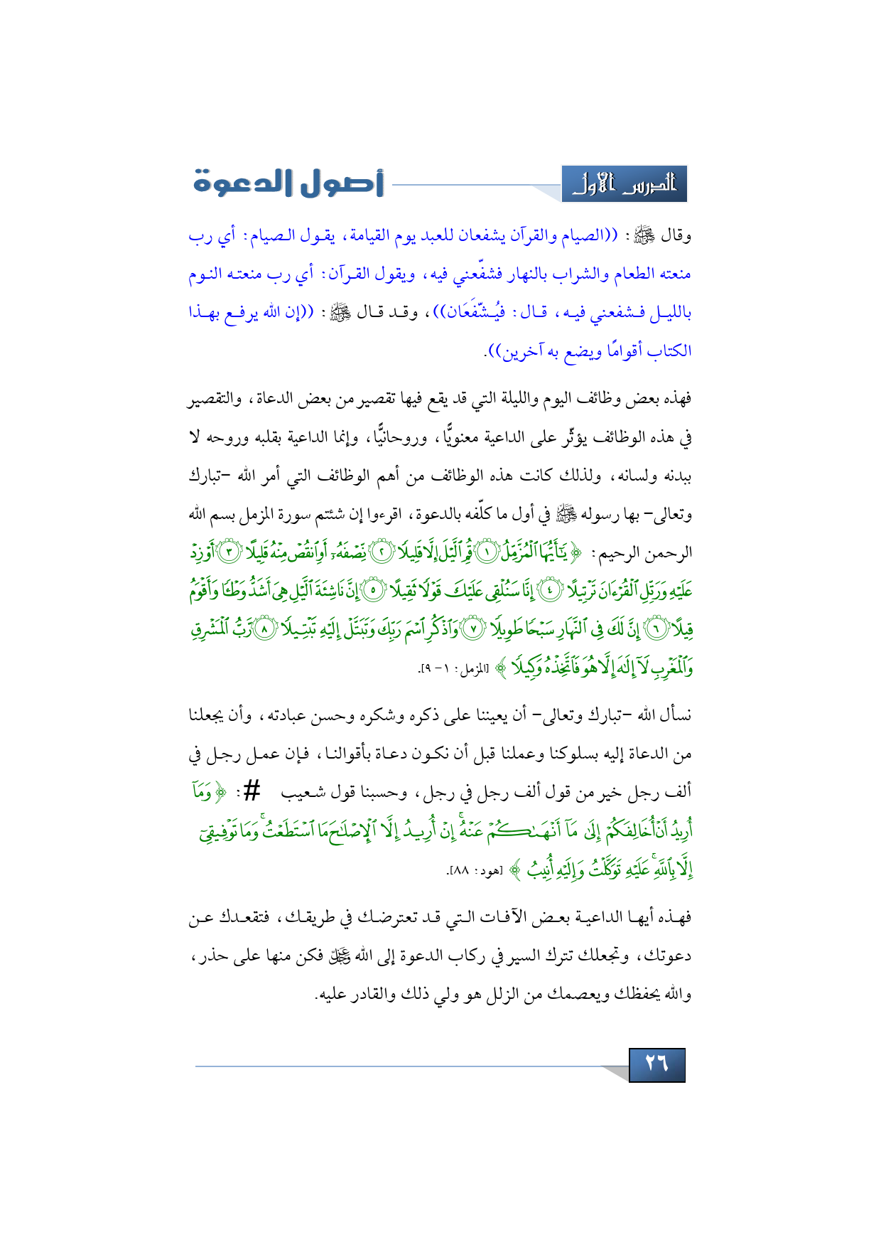 فهذه بعض وظائف اليوم والليلة التي قد يقع فيها تقصير من بعض الدعاة، والتقصير في هذه الوظائف يؤثّر على الداعية معنويًّا، وروحانيًّا، وإنما الداعية بقلبه وروحه لا ببدنه ولسانه، ولذلك كانت هذه الوظائف من أهم الوظائف التي أمر الله -تبارك وتعالى- بها رسوله -صلى الله عليه وسلم- في أول ما كلّفه بالدعوة، اقرءوا إن شئتم سورة المزمل بسم الله الرحمن الرحيم: {يَا أَيُّهَا الْمُزَّمِّلُ * قُمِ اللَّيْلَ إِلَّا قَلِيلًا * نِصْفَهُ أَوِ انْقُصْ مِنْهُ قَلِيلًا * أَوْ زِدْ عَلَيْهِ وَرَتِّلِ الْقُرْآنَ تَرْتِيلًا * إِنَّا سَنُلْقِي عَلَيْكَ قَوْلًا ثَقِيلًا * إِنَّ نَاشِئَةَ اللَّيْلِ هِيَ أَشَدُّ وَطْئًا وَأَقْوَمُ قِيلًا * إِنَّ لَكَ فِي اَلنَّهَارِ سَبْحًا طَوِيلًا * وَاذْكُرِ اسْمَ رَبِّكَ وَتَبَتَّلْ إِلَيْهِ تَبْتِيلًا * رَبُّ الْمَشْرِقِ وَالْمَغْرِبِ لَا إِلَهَ إِلَّا هُوَ فَاتَّخِذْهُ وَكِيلًا} (المزمل: 1 - 9).