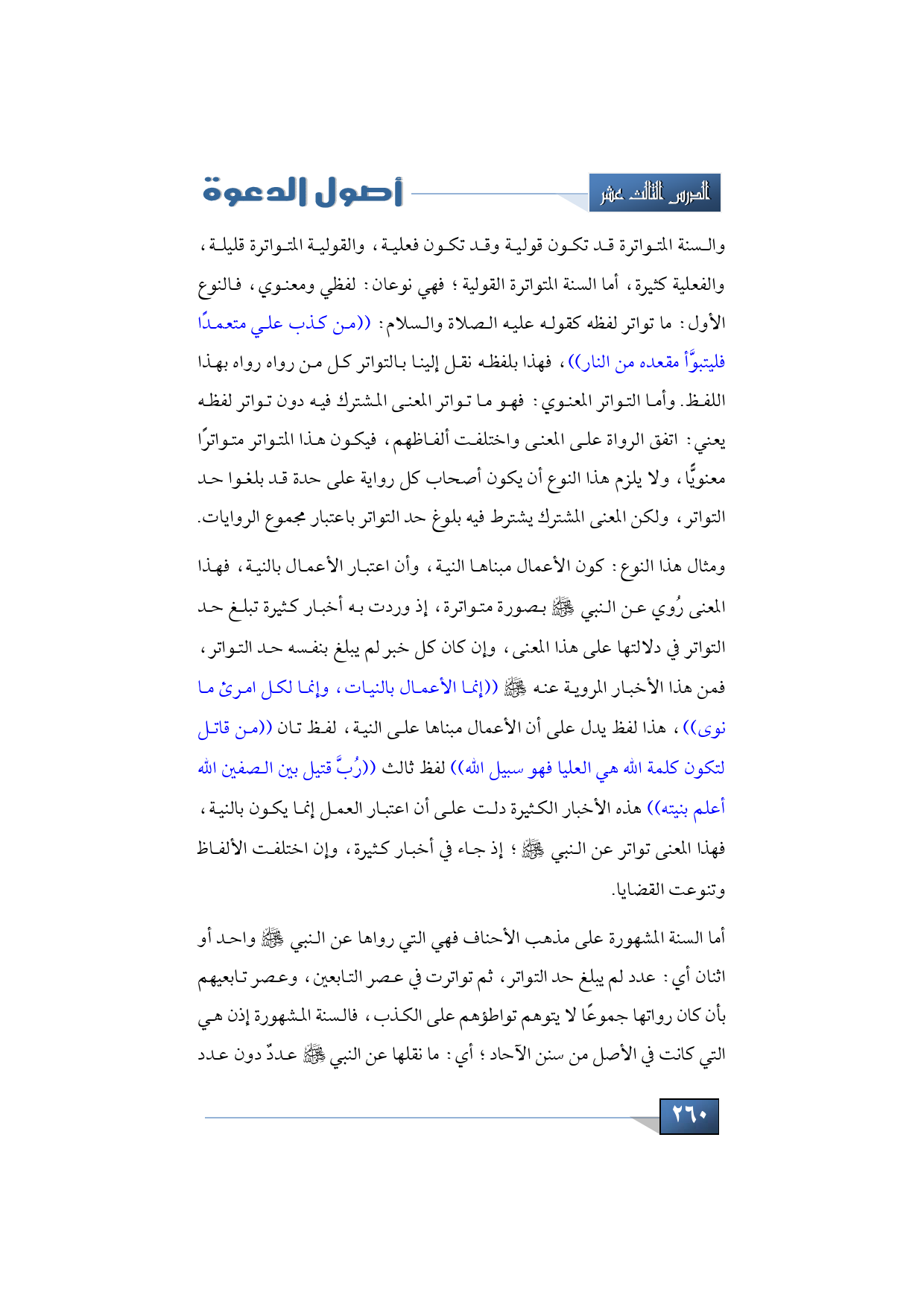 ومثال هذا النوع: كون الأعمال مبناها النية، وأن اعتبار الأعمال بالنية، فهذا المعنى رُوي عن النبي -صلى الله عليه وسلم- بصورة متواترة، إذ وردت به أخبار كثيرة تبلغ حد التواتر في دلالتها على هذا المعنى، وإن كان كل خبر لم يبلغ بنفسه حد التواتر، فمن هذا الأخبار المروية عنه -صلى الله عليه وسلم- ((إنما الأعمال بالنيات، وإنما لكل امرئ ما نوى))، هذا لفظ يدل على أن الأعمال مبناها على النية، لفظ تان ((من قاتل لتكون كلمة الله هي العليا فهو سبيل الله)) لفظ ثالث ((رُبَّ قتيل بين الصفين الله أعلم بنيته)) هذه الأخبار الكثيرة دلت على أن اعتبار العمل إنما يكون بالنية، فهذا المعنى تواتر عن النبي -صلى الله عليه وسلم؛ إذ جاء في أخبار كثيرة، وإن اختلفت الألفاظ وتنوعت القضايا.