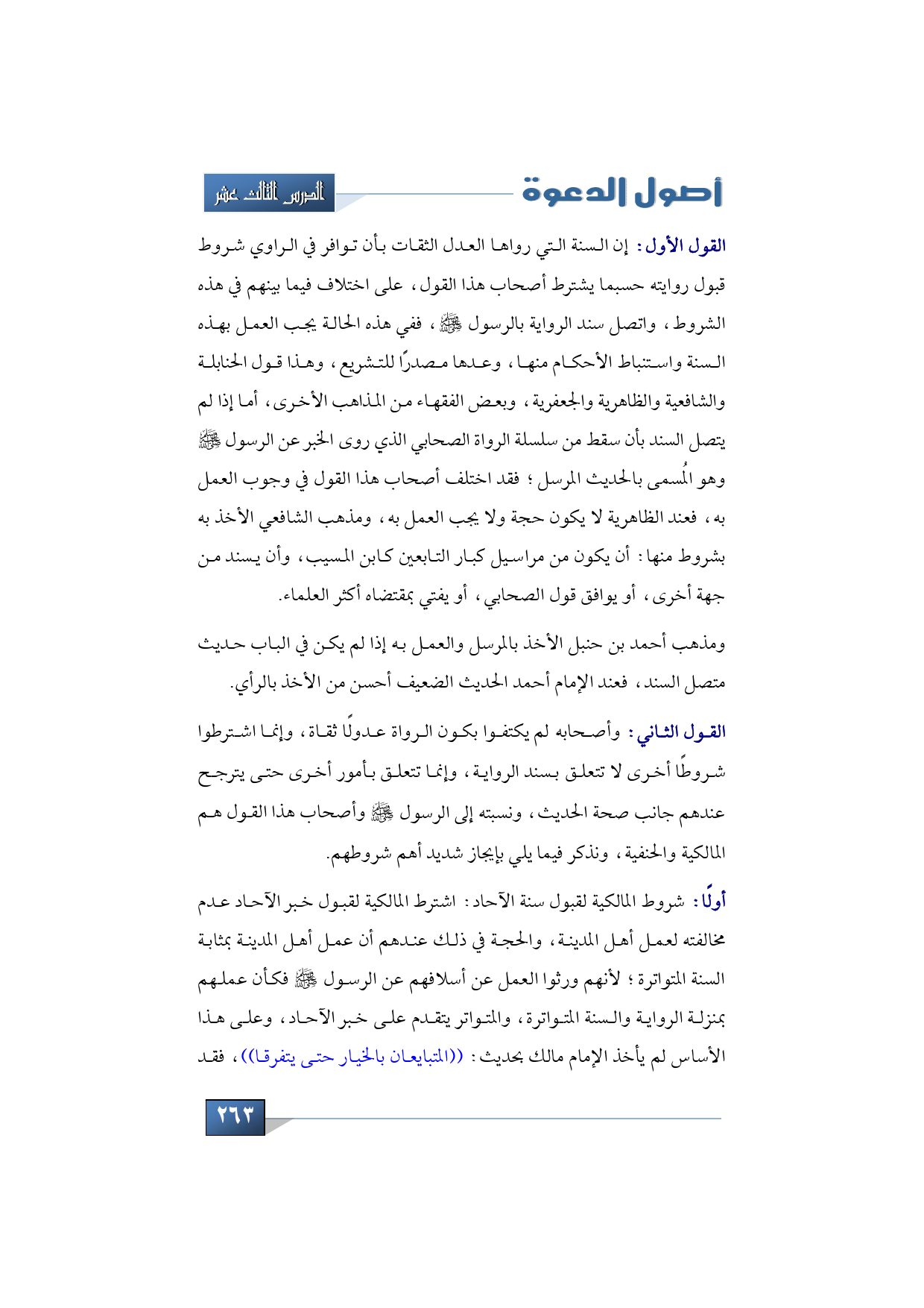 أولًا: شروط المالكية لقبول سنة الآحاد: اشترط المالكية لقبول خبر الآحاد عدم مخالفته لعمل أهل المدينة، والحجة في ذلك عندهم أن عمل أهل المدينة بمثابة السنة المتواترة؛ لأنهم ورثوا العمل عن أسلافهم عن الرسول -صلى الله عليه وسلم- فكأن عملهم بمنزلة الرواية والسنة المتواترة، والمتواتر يتقدم على خبر الآحاد، وعلى هذا الأساس لم يأخذ الإمام مالك بحديث: ((المتبايعان بالخيار حتى يتفرقا))،