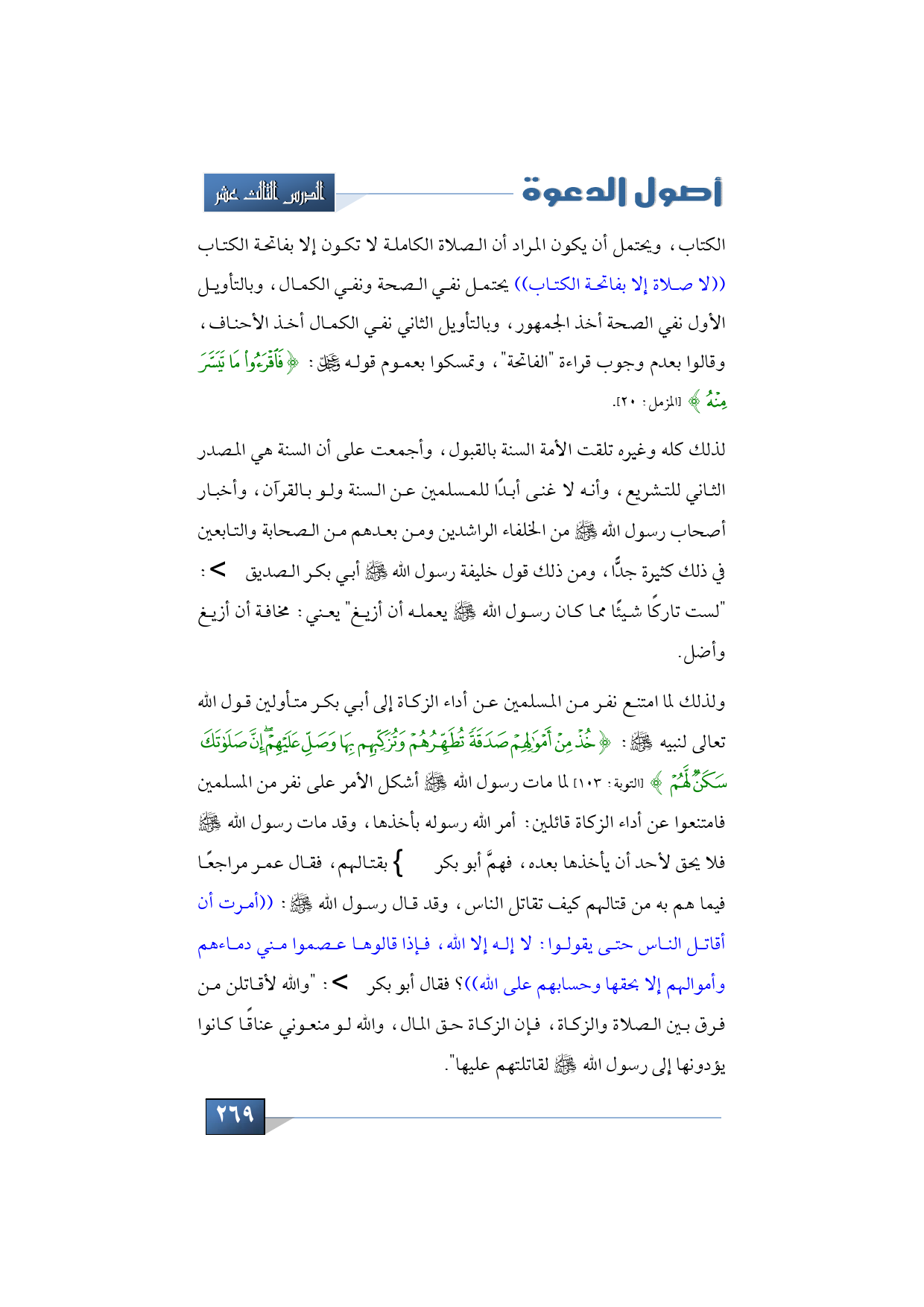 ولذلك لما امتنع نفر من المسلمين عن أداء الزكاة إلى أبي بكر متأولين قول الله تعالى لنبيه -صلى الله عليه وسلم-: {خُذْ مِنْ أَمْوَالِهِمْ صَدَقَةً تُطَهِّرُهُمْ وَتُزَكِّيهِمْ بِهَا وَصَلِّ عَلَيْهِمْ إِنَّ صَلَاتَكَ سَكَنٌ لَهُمْ} (التوبة: 103) لما مات رسول الله -صلى الله عليه وسلم- أشكل الأمر على نفر من المسلمين فامتنعوا عن أداء الزكاة قائلين: أمر الله رسوله بأخذها، وقد مات رسول الله -صلى الله عليه وسلم- فلا يحق لأحد أن يأخذها بعده، فهمَّ أبو بكر -رضي الله عنهم- بقتالهم، فقال عمر مراجعًا فيما هم به من قتالهم كيف تقاتل الناس، وقد قال رسول الله -صلى الله عليه وسلم-: ((أمرت أن أقاتل الناس حتى يقولوا: لا إله إلا الله، فإذا قالوها عصموا مني دماءهم وأموالهم إلا بحقها وحسابهم على الله))؟ فقال أبو بكر -رضي الله عنه-: "والله لأقاتلن من فرق بين الصلاة والزكاة، فإن الزكاة حق المال، والله لو منعوني عناقًا كانوا يؤدونها إلى رسول الله -صلى الله عليه وسلم- لقاتلتهم عليها".