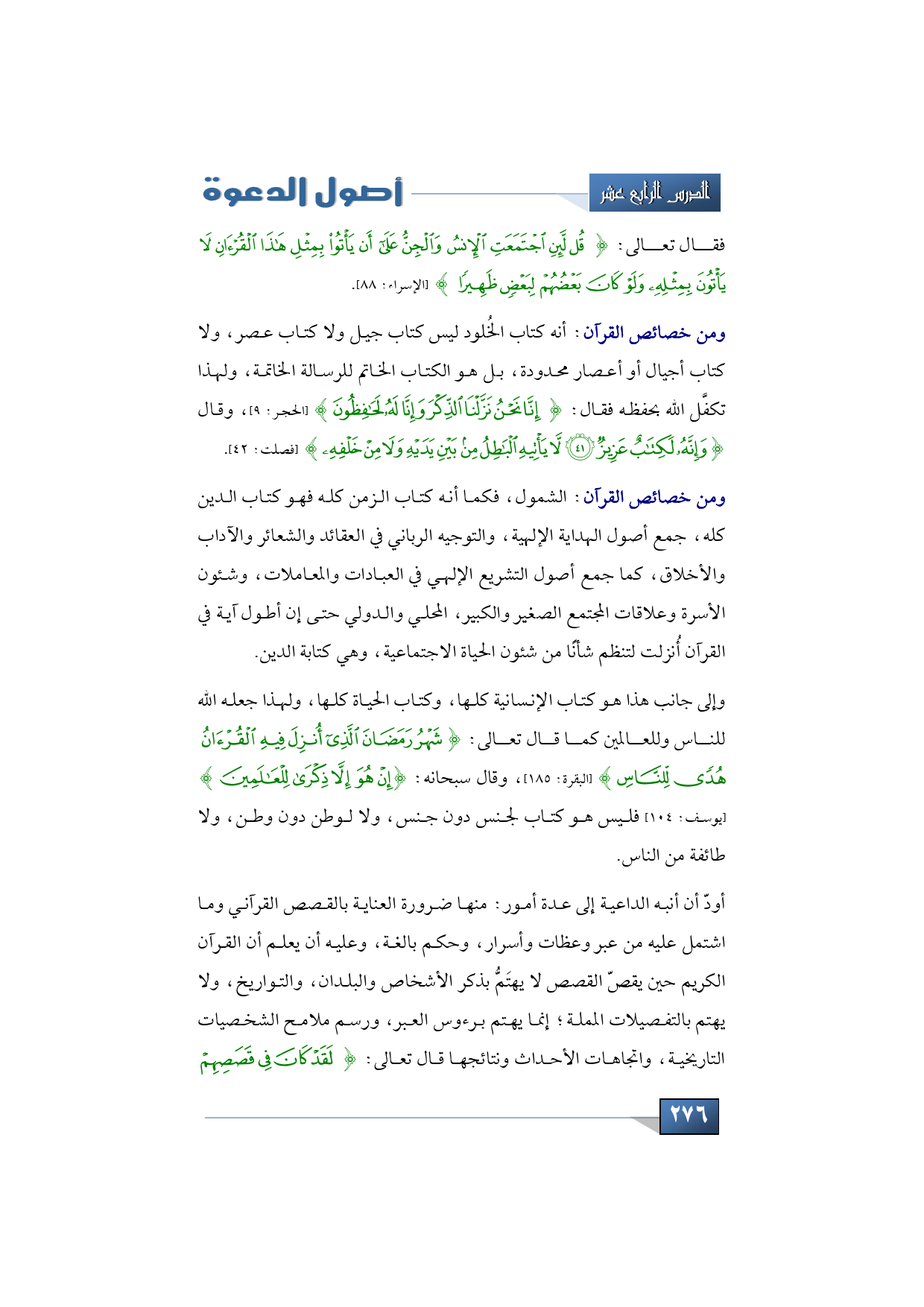 ومن خصائص القرآن أنه كتاب الخُلود ليس كتاب جيل ولا كتاب عصر، ولا كتاب أجيال أو أعصار محدودة، بل هو الكتاب الخاتم للرسالة الخاتمة، ولهذا تكفَّل الله بحفظه فقال: {إِنَّا نَحْنُ نَزَّلْنَا الذِّكْرَ وَإِنَّا لَهُ لَحَافِظُونَ} (الحجر: 9)، وقال {وَإِنَّهُ لَكِتَابٌ عَزِيزٌ * لا يَأْتِيهِ الْبَاطِلُ مِنْ بَيْنِ يَدَيْهِ وَلا مِنْ خَلْفِهِ} (فصلت: 42)، ومن خصائص القرآن الشمول، فكما أنه كتاب الزمن كله فهو كتاب الدين كله، جمع أصول الهداية الإلهية، والتوجيه الرباني في العقائد والشعائر والآداب والأخلاق، كما جمع أصول التشريع الإلهي في العبادات والمعاملات، وشئون الأسرة وعلاقات المجتمع الصغير والكبير، المحلي والدولي حتى إن أطول آية في القرآن أُنزلت لتنظم شأنًا من شئون الحياة الاجتماعية، وهي كتابة الدين.