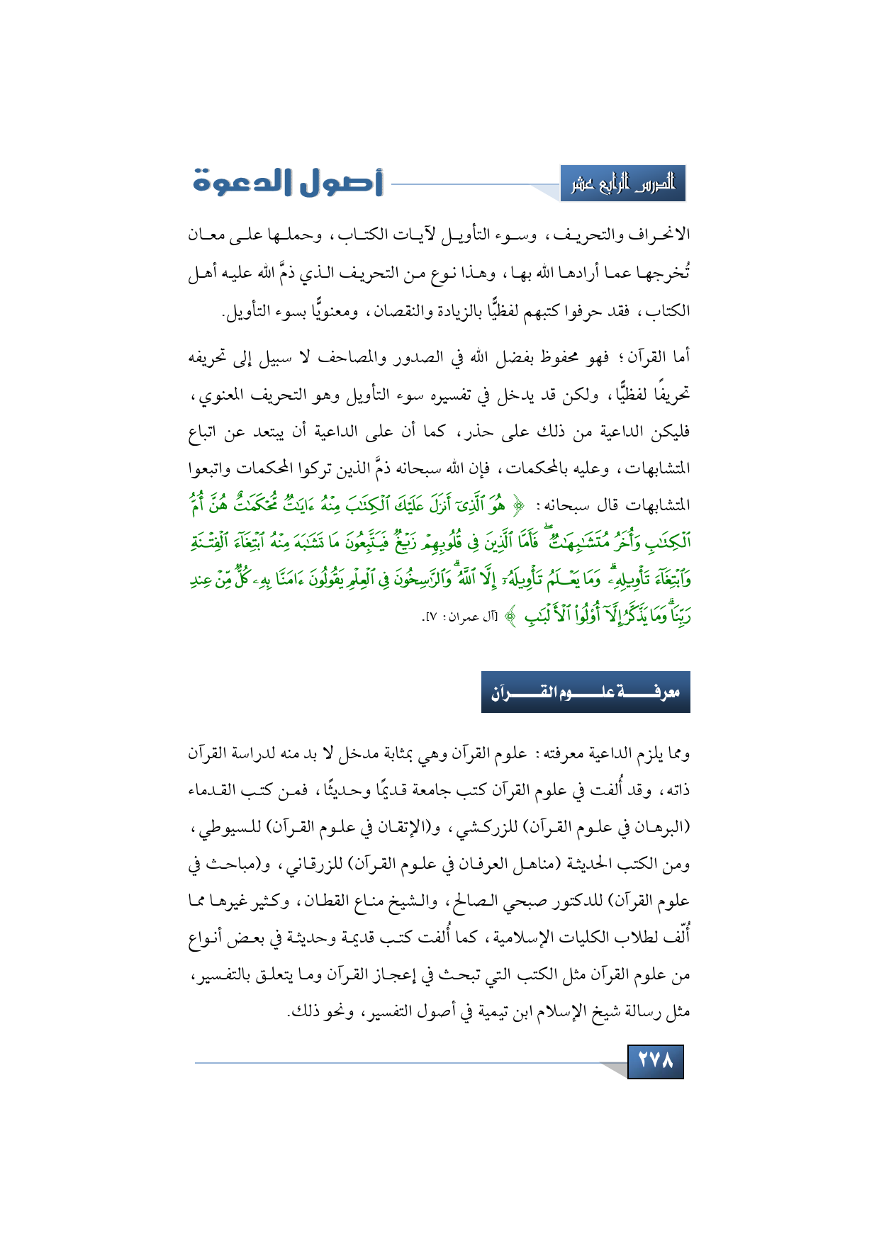أما القرآن؛ فهو محفوظ بفضل الله في الصدور والمصاحف لا سبيل إلى تحريفه تحريفًا لفظيًّا، ولكن قد يدخل في تفسيره سوء التأويل وهو التحريف المعنوي، فليكن الداعية من ذلك على حذر، كما أن على الداعية أن يبتعد عن اتباع المتشابهات، وعليه بالمحكمات، فإن الله سبحانه ذمَّ الذين تركوا المحكمات واتبعوا المتشابهات قال سبحانه: {هُوَ الَّذِي أَنْزَلَ عَلَيْكَ الْكِتَابَ مِنْهُ آيَاتٌ مُحْكَمَاتٌ هُنَّ أُمُّ الْكِتَابِ وَأُخَرُ مُتَشَابِهَاتٌ فَأَمَّا الَّذِينَ فِي قُلُوبِهِمْ زَيْغٌ فَيَتَّبِعُونَ مَا تَشَابَهَ مِنْهُ ابْتِغَاءَ الْفِتْنَةِ وَابْتِغَاءَ تَأْوِيلِهِ وَمَا يَعْلَمُ تَأْوِيلَهُ إِلَّا اللَّهُ وَالرَّاسِخُونَ فِي الْعِلْمِ يَقُولُونَ آمَنَّا بِهِ كُلٌّ مِنْ عِنْدِ رَبِّنَا وَمَا يَذَّكَّرُ إِلَّا أُولُو الْأَلْبَابِ} (آل عمران: 7).