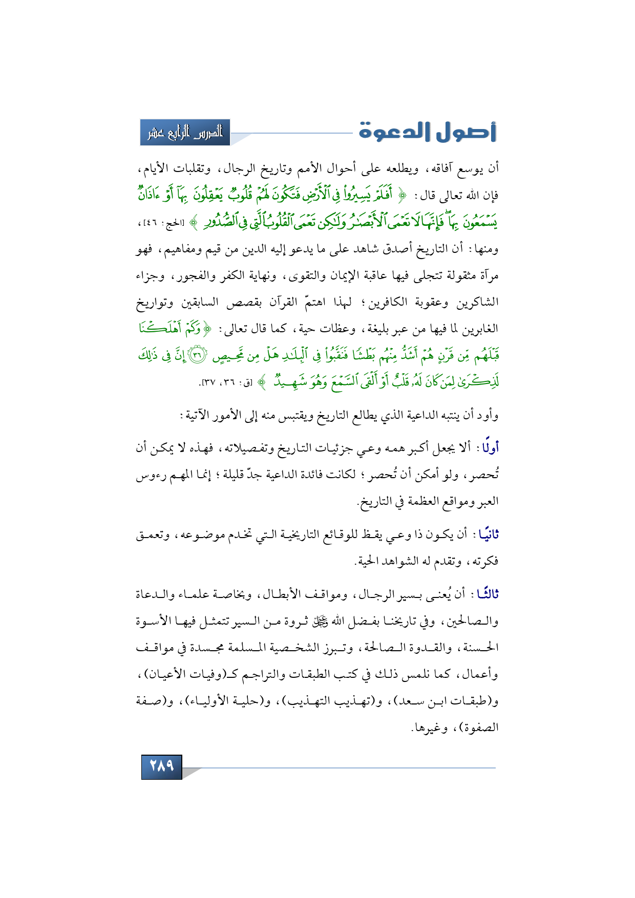 وأود أن ينتبه الداعية الذي يطالع التاريخ ويقتبس منه إلى الأمور الآتية:
