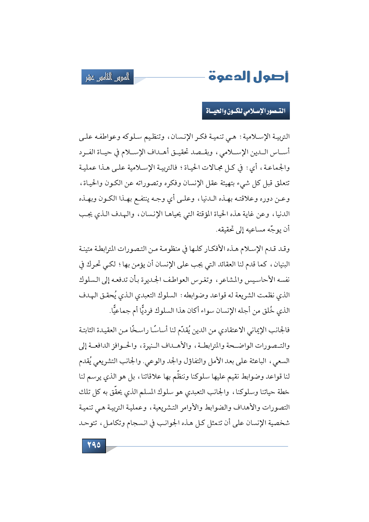 وقد قدم الإسلام هذه الأفكار كلها في منظومة من التصورات المترابطة متينة البنيان، كما قدم لنا العقائد التي يجب على الإنسان أن يؤمن بها؛ لكي تحرك في نفسه الأحاسيس والمشاعر، وتغرس العواطف الجديرة بأن تدفعه إلى السلوك الذي نظمت الشريعة له قواعد وضوابطه: السلوك التعبدي الذي يُحقق الهدف الذي خُلق من أجله الإنسان سواء أكان هذا السلوك فرديًّا أم جماعيًّا.