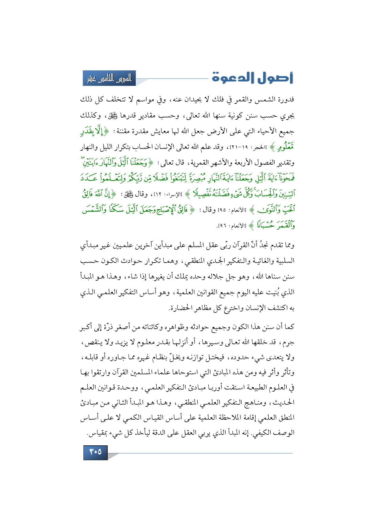 فدورة الشمس والقمر في فلك لا يحيدان عنه، وفي مواسم لا تتخلف كل ذلك يجري حسب سنن كونية سنها الله تعالى، وحسب مقادير قدرها عز وجل، وكذلك جميع الأحياء التي على الأرض جعل الله لها معايش مقدرة مقننة: {وَمَا نُنَزِّلُهُ إِلاَّ بِقَدَرٍ مَعْلُومٍ} (الحجر: 19 - 21)، وقد علم الله تعالى الإنسان الحساب بتكرار الليل والنهار وتقدير الفصول الأربعة والأشهر القمرية، قال تعالى: {وَجَعَلْنَا اللَّيْلَ وَالنَّهَارَ آيَتَيْنِ فَمَحَوْنَا آيَةَ اللَّيْلِ وَجَعَلْنَا آيَةَ النَّهَارِ مُبْصِرَةً لِتَبْتَغُوا فَضْلًا مِنْ رَبِّكُمْ وَلِتَعْلَمُوا عَدَدَ السِّنِينَ وَالْحِسَابَ وَكُلَّ شَيْءٍ فَصَّلْنَاهُ تَفْصِيلًا} (الإسراء: 12)، وقال عز وجل: {إِنَّ اللَّهَ فَالِقُ الْحَبِّ وَالنَّوَى} (الأنعام: 95) وقال: {فَالِقُ الإِصْبَاحِ وَجَعَلَ اللَّيْلَ سَكَنًا وَالشَّمْسَ وَالْقَمَرَ حُسْبَانًا} (الأنعام: 96).