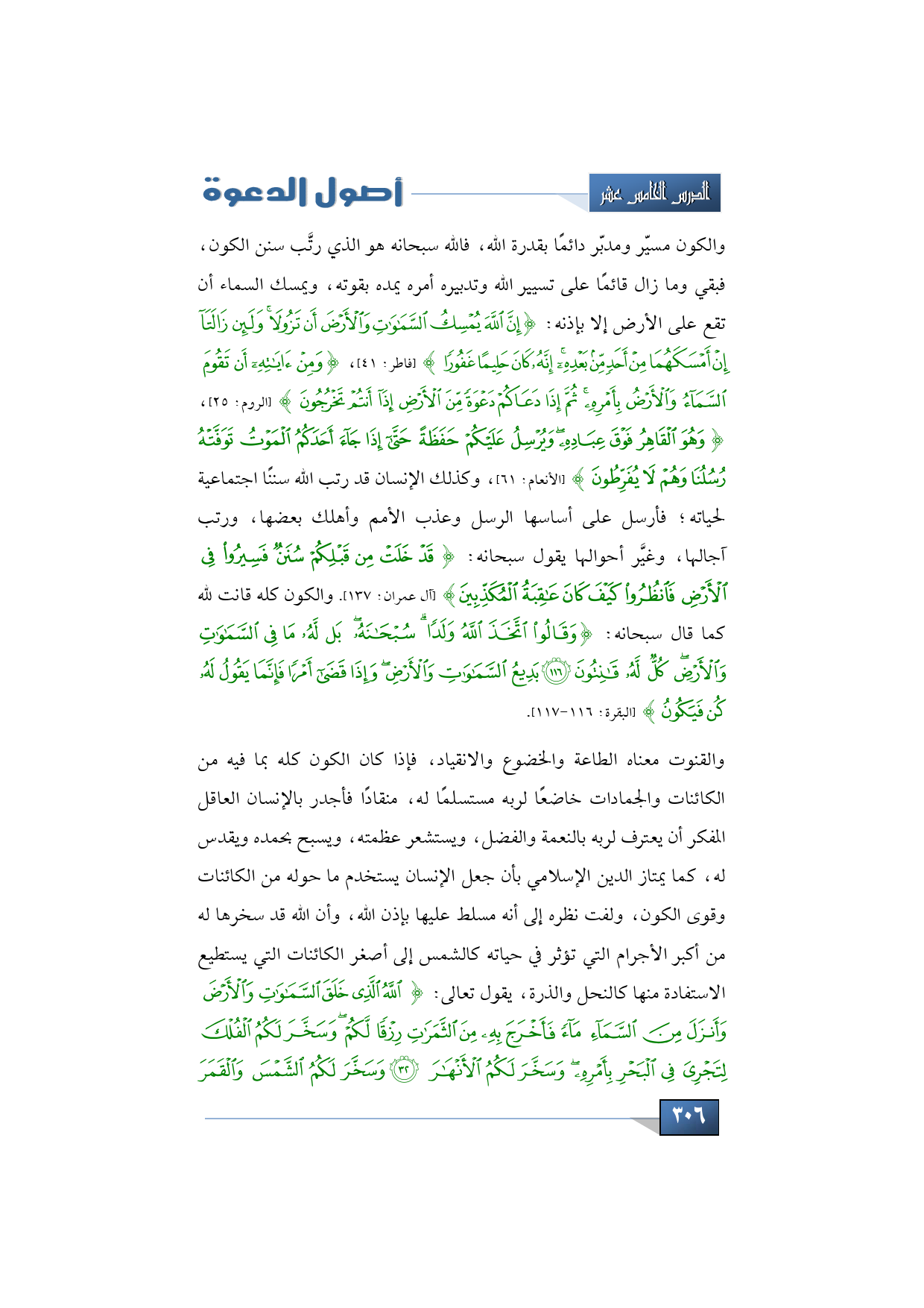 والكون مسيّر ومدبّر دائمًا بقدرة الله، فالله سبحانه هو الذي رتَّب سنن الكون، فبقي وما زال قائمًا على تسيير الله وتدبيره أمره يمده بقوته، ويمسك السماء أن تقع على الأرض إلا بإذنه: {إِنَّ اللَّهَ يُمْسِكُ السَّمَاوَاتِ وَالأَرْضَ أَنْ تَزُولا وَلَئِنْ زَالَتَا إِنْ أَمْسَكَهُمَا مِنْ أَحَدٍ مِنْ بَعْدِهِ إِنَّهُ كَانَ حَلِيمًا غَفُورًا} (فاطر: 41)، {وَمِنْ آيَاتِهِ أَنْ تَقُومَ السَّمَاءُ وَالأَرْضُ بِأَمْرِهِ ثُمَّ إِذَا دَعَاكُمْ دَعْوَةً مِنْ الأَرْضِ إِذَا أَنْتُمْ تَخْرُجُونَ} (الروم: 25)، {وَهُوَ الْقَاهِرُ فَوْقَ عِبَادِهِ وَيُرْسِلُ عَلَيْكُمْ حَفَظَةً حَتَّى إِذَا جَاءَ أَحَدَكُمْ الْمَوْتُ تَوَفَّتْهُ رُسُلُنَا وَهُمْ لا يُفَرِّطُونَ} (الأنعام: 61)، وكذلك الإنسان قد رتب الله سننًا اجتماعية لحياته؛ فأرسل على أساسها الرسل وعذب الأمم وأهلك بعضها، ورتب آجالها، وغيَّر أحوالها يقول سبحانه: {قَدْ خَلَتْ مِنْ قَبْلِكُمْ سُنَنٌ فَسِيرُوا فِي الأَرْضِ فَانْظُروا كَيْفَ كَانَ عَاقِبَةُ الْمُكَذِّبِينَ} (آل عمران: 137). والكون كله قانت لله كما قال سبحانه: {وَقَالُوا اتَّخَذَ اللَّهُ وَلَدًا سُبْحَانَهُ بَلْ لَهُ مَا فِي السَّمَاوَاتِ وَالأَرْضِ كُلٌّ لَهُ قَانِتُونَ * بَدِيعُ السَّمَاوَاتِ وَالأَرْضِ وَإِذَا قَضَى أَمْرًا فَإِنَّمَا يَقُولُ لَهُ كُنْ فَيَكُونُ} (البقرة: 117 - 117).