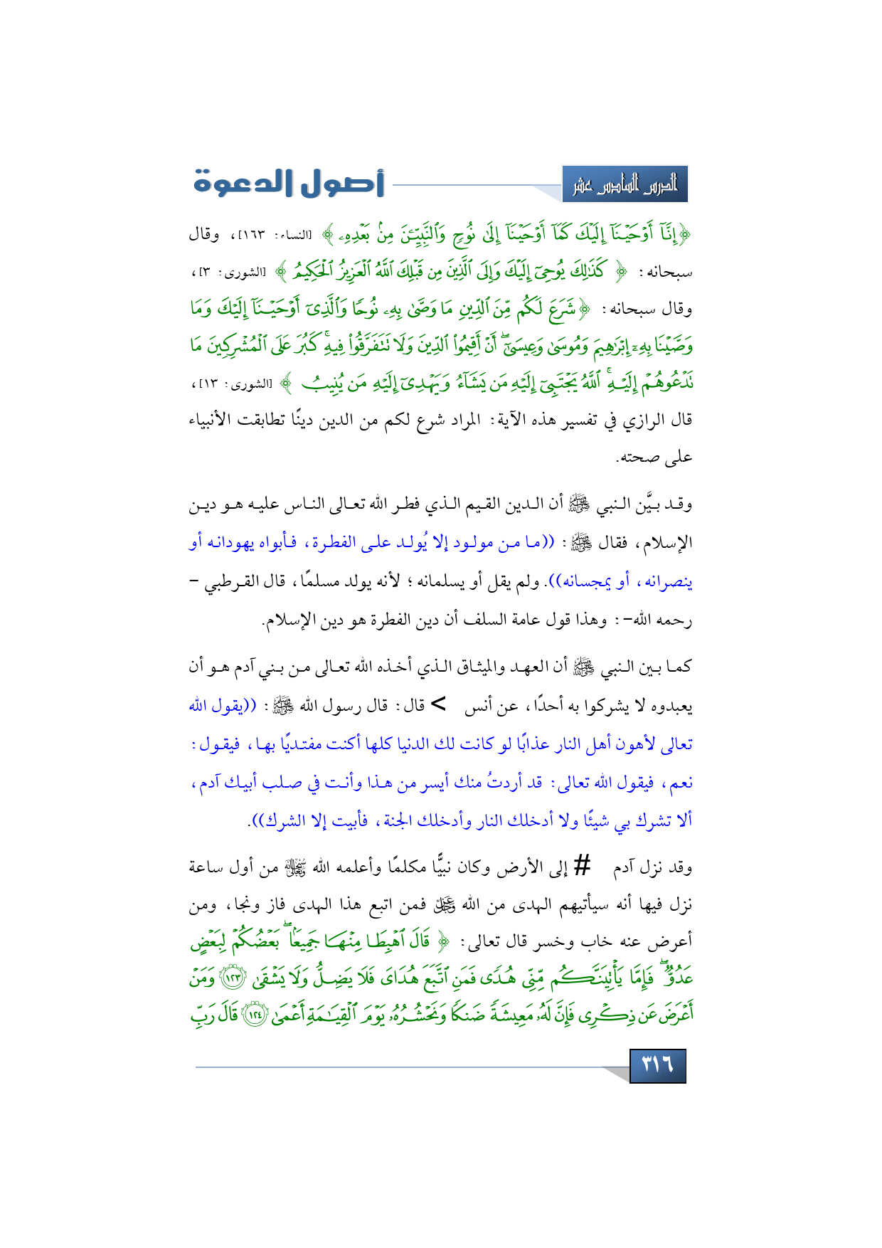{إِنَّا أَوْحَيْنَا إِلَيْكَ كَمَا أَوْحَيْنَا إِلَى نُوحٍ وَالنَّبِيِّينَ مِنْ بَعْدِهِ} (النساء: 163)، وقال سبحانه: {كَذَلِكَ يُوحِي إِلَيْكَ وَإِلَى الَّذِينَ مِنْ قَبْلِكَ اللَّهُ الْعَزِيزُ الْحَكِيمُ} (الشورى: 3)، وقال سبحانه: {شَرَعَ لَكُمْ مِنَ الدِّينِ مَا وَصَّى بِهِ نُوحًا وَالَّذِي أَوْحَيْنَا إِلَيْكَ وَمَا وَصَّيْنَا بِهِ إِبْرَاهِيمَ وَمُوسَى وَعِيسَى أَنْ أَقِيمُوا الدِّينَ وَلَا تَتَفَرَّقُوا فِيهِ كَبُرَ عَلَى الْمُشْرِكِينَ مَا تَدْعُوهُمْ إِلَيْهِ اللَّهُ يَجْتَبِي إِلَيْهِ مَنْ يَشَاءُ وَيَهْدِي إِلَيْهِ مَنْ يُنِيبُ} (الشورى: 13)، قال الرازي في تفسير هذه الآية: المراد شرع لكم من الدين دينًا تطابقت الأنبياء على صحته.