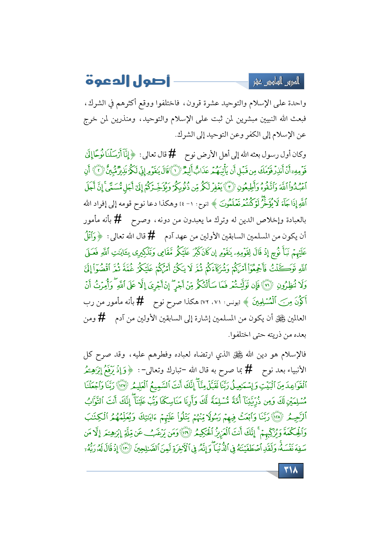 واحدة على الإسلام والتوحيد عشرة قرون، فاختلفوا ووقع أكثرهم في الشرك، فبعث الله النبيين مبشرين لمن ثبت على الإسلام والتوحيد، ومنذرين لمن خرج عن الإسلام إلى الكفر وعن التوحيد إلى الشرك.