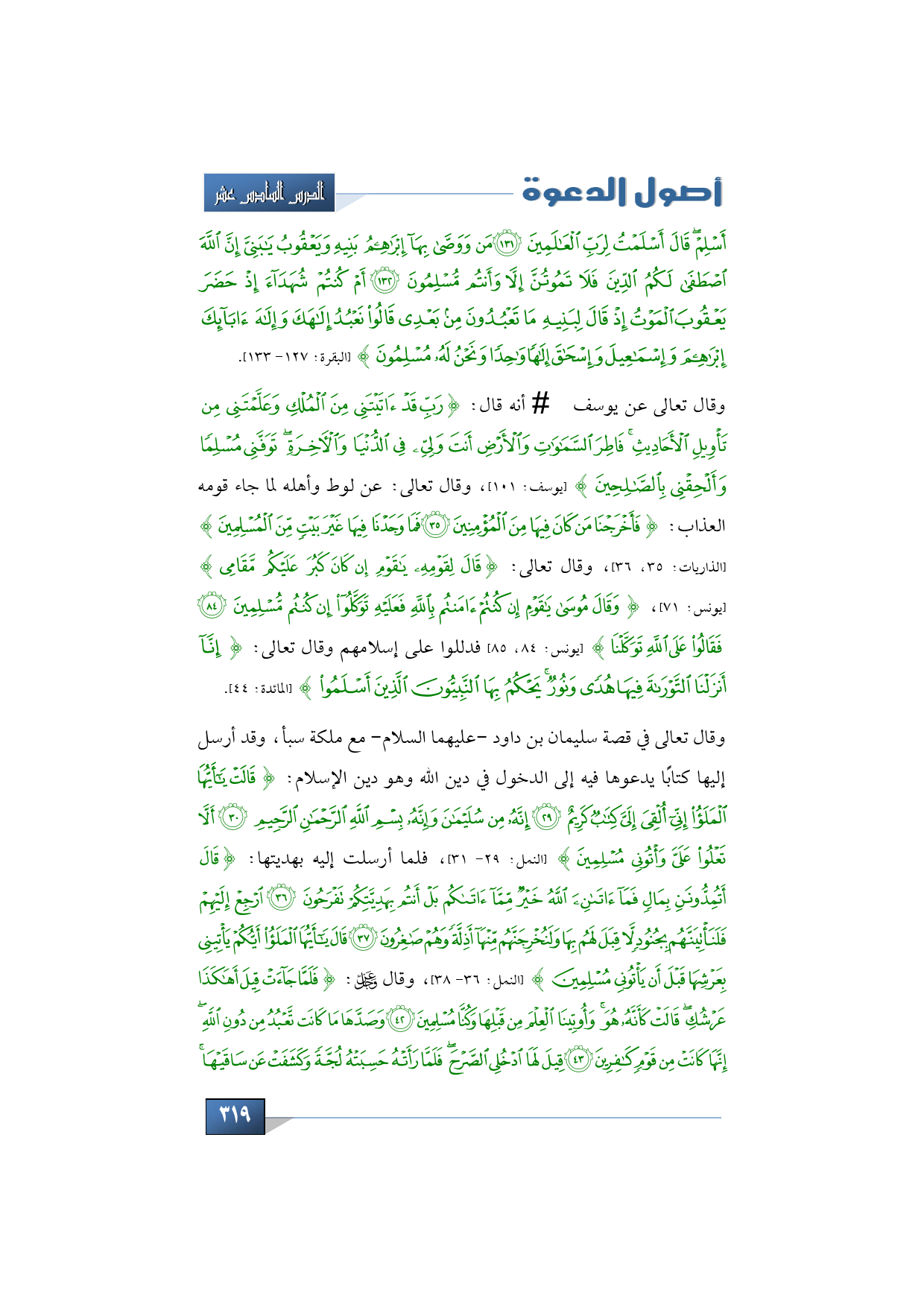 وقال تعالى: عن يوسف -عليه السلام- أنه قال: {رَبِّ قَدْ آتَيْتَنِي مِنَ الْمُلْكِ وَعَلَّمْتَنِي مِنْ تَأْوِيلِ الْأَحَادِيثِ فَاطِرَ السَّمَاوَاتِ وَالْأَرْضِ أَنْتَ وَلِيِّي فِي الدُّنْيَا وَالْآخِرَةِ تَوَفَّنِي مُسْلِمًا وَأَلْحِقْنِي بِالصَّالِحِينَ} (يوسف: 101)، وقال تعالى: عن لوط وأهله لما جاء قومه العذاب: {فَأَخْرَجْنَا مَنْ كَانَ فِيهَا مِنَ الْمُؤْمِنِينَ * فَمَا وَجَدْنَا فِيهَا غَيْرَ بَيْتٍ مِنَ الْمُسْلِمِينَ} (الذاريات: 35، 36)، وقال تعالى: {قَالَ لِقَوْمِهِ يَا قَوْم إِنْ كَانَ كَبُرَ عَلَيْكُمْ مَقَامِي} (يونس: 71)، {وَقَالَ مُوسَى يَا قَوْم إِنْ كُنْتُمْ آمَنْتُمْ بِاللَّهِ فَعَلَيْهِ تَوَكَّلُوا إِنْ كُنْتُمْ مُسْلِمِينَ * فَقَالُوا عَلَى اللَّهِ تَوَكَّلْنَا} (يونس: 84، 85) فدللوا على إسلامهم وقال تعالى: {إِنَّا أَنْزَلْنَا التَّوْرَاةَ فِيهَا هُدًى وَنُورٌ يَحْكُمُ بِهَا النَّبِيُّونَ الَّذِينَ أَسْلَمُوا} (المائدة: 44).