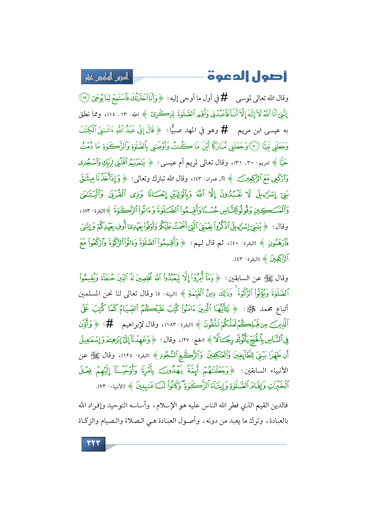 وقال -سبحانه وتعالى- عن السابقين: {وَمَا أُمِرُوا إِلَّا لِيَعْبُدُوا اللَّهَ مُخْلِصِينَ لَهُ الدِّينَ حُنَفَاءَ وَيُقِيمُوا الصَّلَاةَ وَيُؤْتُوا الزَّكَاةَ وَذَلِكَ دِينُ الْقَيِّمَةِ} (البينة: 5) وقال تعالى لنا نحن المسلمين أتباع محمد -صلى الله عليه وسلم-: {يَا أَيُّهَا الَّذِينَ آمَنُوا كُتِبَ عَلَيْكُمُ الصِّيَامُ كَمَا كُتِبَ عَلَى الَّذِينَ مِنْ قَبْلِكُمْ لَعَلَّكُمْ تَتَّقُونَ} (البقرة: 183)، وقال لإبراهيم - عليه السلام-: {وَأَذِّنْ فِي النَّاسِ بِالْحَجِّ يَأْتُوكَ رِجَالًا} (الحج: 27)، وقال: {وَعَهِدْنَا إِلَى إِبْرَاهِيمَ وَإِسْمَاعِيلَ أَنْ طَهِّرَا بَيْتِيَ لِلطَّائِفِينَ وَالْعَاكِفِينَ وَالرُّكَّعِ السُّجُودِ} (البقرة: 125)، وقال -سبحانه وتعالى- عن الأنبياء السابقين: {وَجَعَلْنَاهُمْ أَئِمَّةً يَهْدُونَ بِأَمْرِنَا وَأَوْحَيْنَا إِلَيْهِمْ فِعْلَ الْخَيْرَاتِ وَإِقَامَ الصَّلَاةِ وَإِيتَاءَ الزَّكَاةِ وَكَانُوا لَنَا عَابِدِينَ} (الأنبياء: 73).