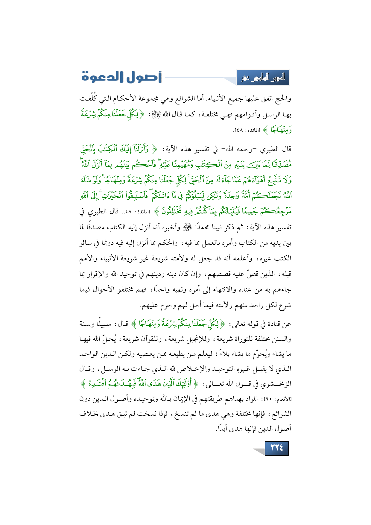 قال الطبري - رحمه الله - في تفسير هذه الآية: {وَأَنْزَلْنَا إِلَيْكَ الْكِتَابَ بِالْحَقِّ مُصَدِّقًا لِمَا بَيْنَ يَدَيْهِ مِنَ الْكِتَابِ وَمُهَيْمِنًا عَلَيْهِ فَاحْكُمْ بَيْنَهُمْ بِمَا أَنْزَلَ اللَّهُ وَلَا تَتَّبِعْ أَهْوَاءَهُمْ عَمَّا جَاءَكَ مِنَ الْحَقِّ لِكُلٍّ جَعَلْنَا مِنْكُمْ شِرْعَةً وَمِنْهَاجًا وَلَوْ شَاءَ اللَّهُ لَجَعَلَكُمْ أُمَّةً وَاحِدَةً وَلَكِنْ لِيَبْلُوَكُمْ فِي مَا آتَاكُمْ فَاسْتَبِقُوا الْخَيْرَاتِ إِلَى اللَّهِ مَرْجِعُكُمْ جَمِيعًا فَيُنَبِّئُكُمْ بِمَا كُنْتُمْ فِيهِ تَخْتَلِفُونَ} (المائدة: 48). قال الطبري في تفسير هذه الآية: ثم ذكر نبينا محمدًا -صلى الله عليه وسلم- وأخبره أنه أنزل إليه الكتاب مصدقًا لما بين يديه من الكتاب وأمره بالعمل بما فيه، والحكم بما أنزل إليه فيه دونما في سائر الكتب غيره، وأعلمه أنه قد جعل له ولأمته شريعة غير شريعة الأنبياء والأمم قبله، الذين قص ّ عليه قصصهم، وإن كان دينه ودينهم في توحيد الله والإقرار بما جاءهم به من عنده والانتهاء إلى أمره ونهيه واحدًا، فهم مختلفو الأحوال فيما شرع لكل واحد منهم ولأمته فيما أحل لهم وحرم عليهم.