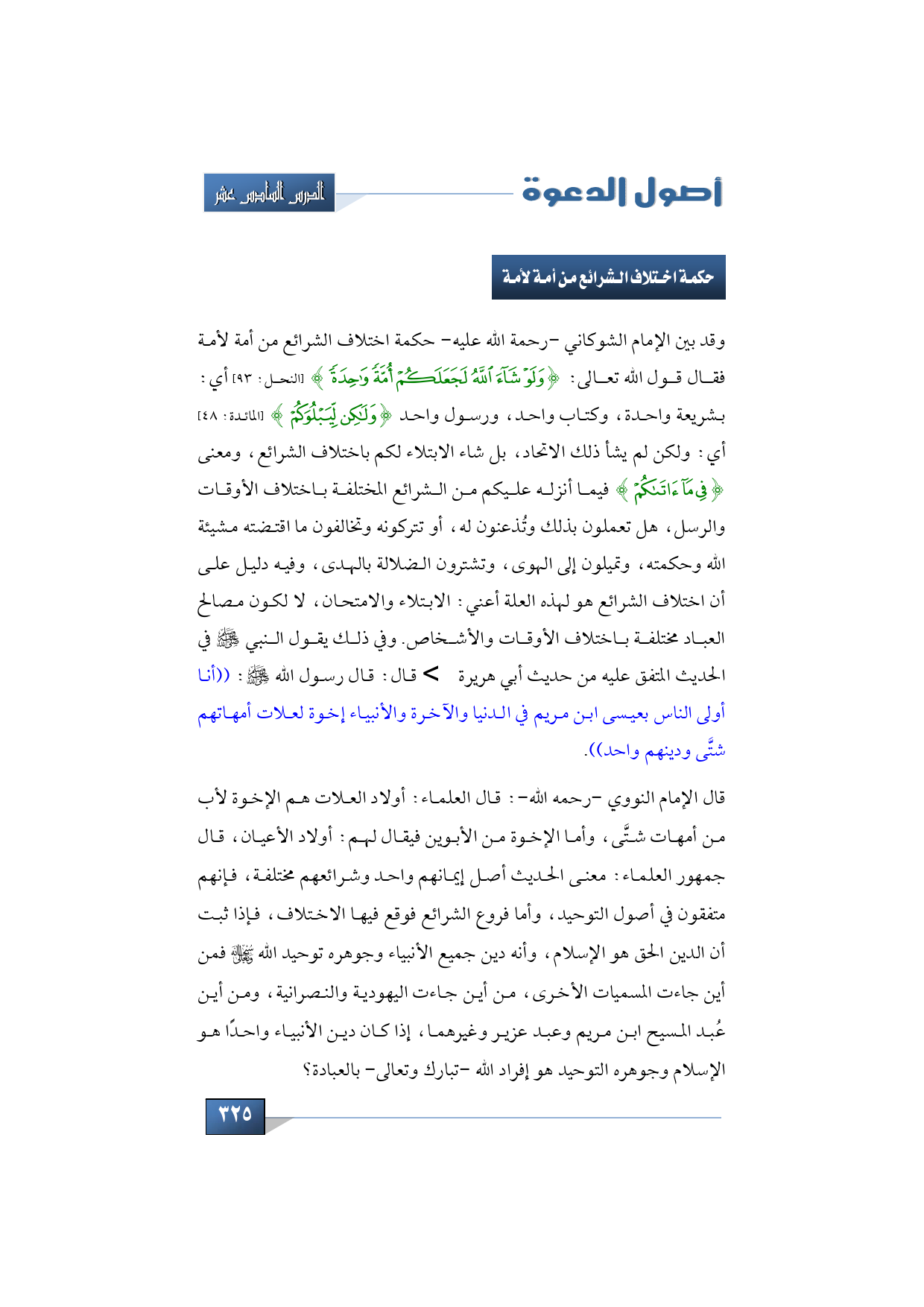 وقد بين الإمام الشوكاني - رحمة الله عليه - حكمة اختلاف الشرائع من أمة لأمة فقال قول الله تعالى: {وَلَوْ شَاءَ اللَّهُ لَجَعَلَكُمْ أُمَّةً وَاحِدَةً} (النحل: 93) أي: بشريعة واحدة، وكتاب واحد، ورسول واحد {وَلَكِنْ لِيَبْلُوَكُمْ} (المائدة: 48) أي: ولكن لم يشأ ذلك الاتحاد، بل شاء الابتلاء لكم باختلاف الشرائع، ومعنى {ف ِ يم َ اآ َ ت َ اك ُ م ْ} فيما أنزله عليكم من الشرائع المختلفة باختلاف الأوقات والرسل، هل تعملون ب ذلك وت ُ ذعنون له، أوتتركونه وتخالفون ما اقتضته مشيئة الله وحكمته، وتميلون إلى الهوى، وتشترون الضلالة بالهدى، وفيه دليل على أن اختلاف الشرائع هو لهذه العلة أعني: الابتلاء والامتحان، لا لكون مصالح العباد مختلفة باختلاف الأوقات والأشخاص. وفي ذلك يقول النبي -صلى الله عليه وسلم- في الحديث المتفق عليه من حديث أبي هريرة -رضي الله عنه- قال: قال رسول الله - صلى الله عليه وسلم-: ((أنا أولى الناس بعيسى ابن مريم في الدنيا والآخرة والأنبياء إخوة لعلات أمهاتهم شت َّ ى ودينهم واحد)).