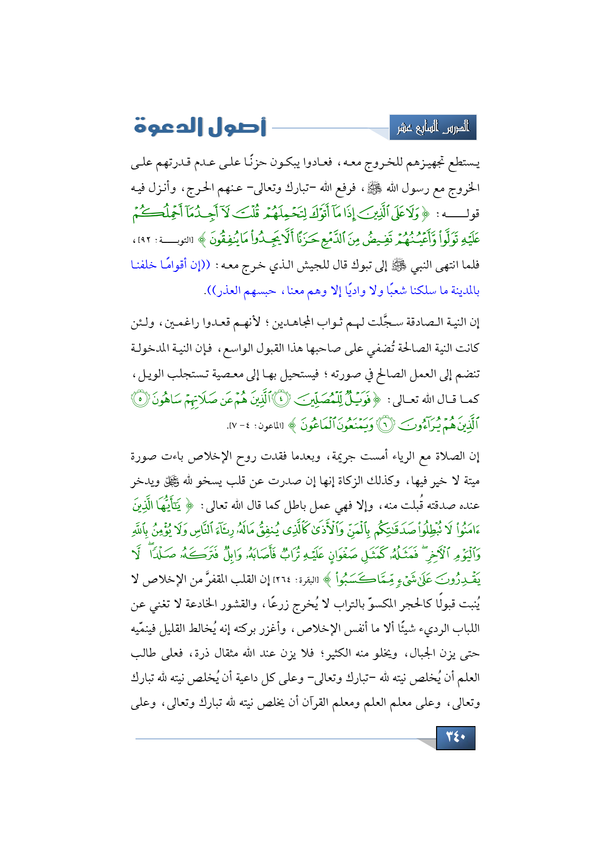 إن الصلاة مع الرياء أمست جريمة، وبعدما فقدت روح الإخلاص باءت صورة ميتة لا خير فيها، وكذلك الزكاة إنها إن صدرت عن قلب يسخو لله -عز وجل - ويدخر عنده صدقته ق ُ بلت منه، وإلا فهي عمل باطل كما قال الله تعالى: {يَا أَيُّهَا الَّذِينَ آمَنُوا لَا تُبْطِلُوا صَدَقَاتِكُمْ بِالْمَنِّ وَالْأَذَى كَالَّذِي يُنْفِقُ مَالَهُ رِئَاءَ النَّاسِ وَلَا يُؤْمِنُ بِاللَّهِ وَالْيَوْمِ الْآخِرِ فَمَثَلُهُ كَمَثَلِ صَفْوَانٍ عَلَيْهِ تُرَابٌ فَأَصَابَهُ وَابِلٌ فَتَرَكَهُ صَلْدًا لَا يَقْدِرُونَ عَلَى شَيْءٍ مِمَّا كَسَبُوا} (البقرة: 264) إن القلب المقفرَّ من الإخلاص لا ي ُ نبت قبول ً اكالحجر المكسو ّ بالتراب لا ي ُ خرج زرع ً ا، والقشور الخادعة لا تغني عن اللباب الرديء شيئ ً األا ما أنفس الإخلاص، وأغزر بركته إنه ي ُ خالط القليل فينم ّي هـ حتى يزن الجبال، ويخلو منه الكثير؛ فلا يزن عند الله مثقال ذرة، فعلى طالب العلم أن ي ُ خلص نيته لله - تبارك وتعالى - وعلى كل داعية أن ي ُ خلص نيته لله تبارك وتعالى، وعلى معلم العلم ومعلم القرآن أن يخلص نيته لله تبارك وتعالى، وعلى