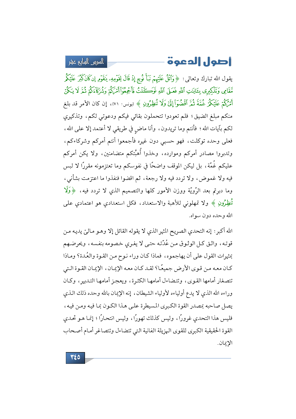 يقول الله تبارك وتعالى: {وَاتْلُ عَلَيْهِمْ نَبَأَ نُوحٍ إِذْ قَالَ لِقَوْمِهِ يَا قَوْم إِنْ كَانَ كَبُرَ عَلَيْكُمْ مَقَامِي وَتَذْكِيرِي بِآيَاتِ اللَّهِ فَعَلَى اللَّهِ تَوَكَّلْتُ فَأَجْمِعُوا أَمْرَكُمْ وَشُرَكَاءَكُمْ ثُمَّ لَا يَكُنْ أَمْرُكُمْ عَلَيْكُمْ غُمَّةً ثُمَّ اقْضُوا إِلَيَّ وَلَا تُنْظِرُونِ} (يونس: 71)، إن كان الأمر قد بلغ منكم مبلغ الضيق؛ فلم تعودوا تتحملون بقائي فيكم ودعوتي لكم، وتذكيري لكم بآيات الله؛ فأنتم وما تريدون، وأنا ماض ٍ في طريقي لا أعتمد إلا على الله، فعلى وحده توكلت، فهو حسبي دون غيره فأجمعوا أنتم أمركم وشركاء كم، وتدبروا مصادر أمركم وموارده، وخذوا أ ُ هبَّتكم متضام ن ين، ولا يكن أمركم عليكم غ ُ م ّ ة، بل ليكن الموقف واضحًا في نفوسكم وما تعتزمونه مقرر ً الا لبس فيه ولا غمو ض، ولا تردد فيه ولا رجعة، ثم اقضوا فنفذوا ما اعتزمت بشأني، وما دبرتم بعد الر ّو ي ّ ة ووزن الأمور كلها والتصميم الذي لا تردد فيه، {و َ ل َ ات ُ ن ْ ظ ِ ر ُ ون َ} ولا تمهلوني للأهبة والاستعداد، فكل استعدادي هو اعتمادي على الله وحده دون سواه.