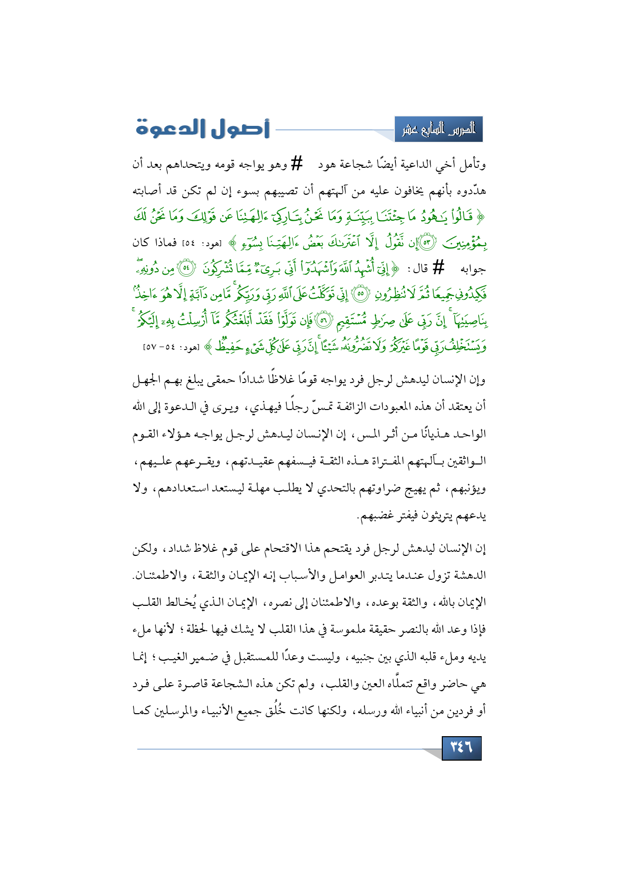 وتأمل أخي الداعية أيضًا شجاعة هود -عليه السلام- وهو يواجه قومه ويتحداهم بعد أن هد ّ دوه بأنهم يخافون عليه من آلهتهم أن تصيبهم بسوء إن لم تكن قد أصابته {قَالُوا يَا هُودُ مَا جِئْتَنَا بِبَيِّنَةٍ وَمَا نَحْنُ بِتَارِكِي آلِهَتِنَا عَنْ قَوْلِكَ وَمَا نَحْنُ لَكَ بِمُؤْمِنِينَ إِنْ نَقُولُ إِلَّا اعْتَرَاكَ بَعْضُ آلِهَتِنَا بِسُوءٍ} (هود: 54) فماذا كان جوابه -عليه السلام- قال: {إِنِّي أُشْهِدُ اللَّهَ وَاشْهَدُوا أَنِّي بَرِيءٌ مِمَّا تُشْرِكُونَ * مِنْ دُونِهِ فَكِيدُونِي جَمِيعًا ثُمَّ لَا تُنْظِرُونِي * إِنِّي تَوَكَّلْتُ عَلَى اللَّهِ رَبِّي وَرَبِّكُمْ مَا مِنْ دَابَّةٍ إِلَّا هُوَ آخِذٌ بِنَاصِيَتِهَا إِنَّ رَبِّي عَلَى صِرَاطٍ مُسْتَقِيمٍ * فَإِنْ تَوَلَّوْا فَقَدْ أَبْلَغْتُكُمْ مَا أُرْسِلْتُ بِهِ إِلَيْكُمْ وَيَسْتَخْلِفُ رَبِّي قَوْمًا غَيْرَكُمْ وَلَا تَضُرُّونَهُ شَيْئًا إِنَّ رَبِّي عَلَى كُلِّ شَيْءٍ حَفِيظٌ} (هود: 54 - 57)