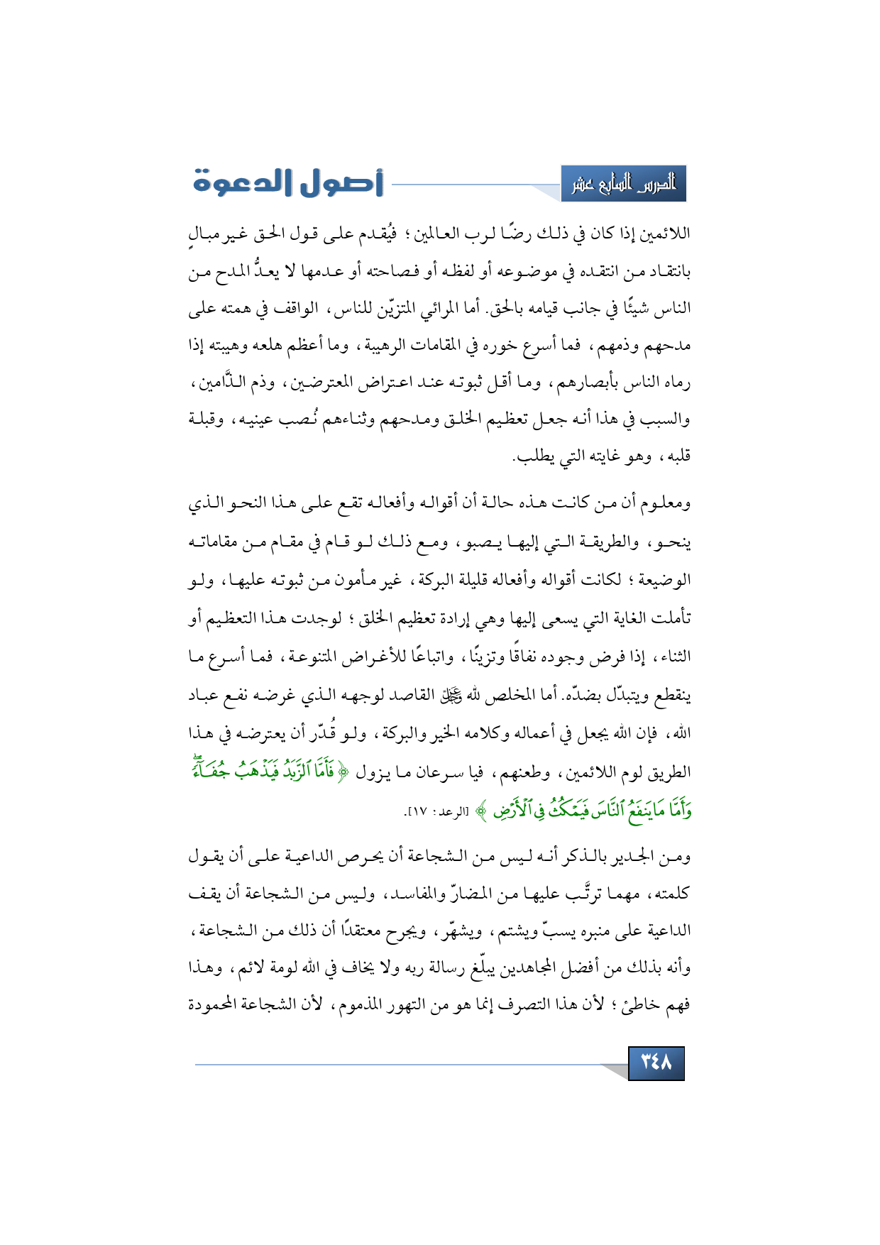 اللائمين إذا كان في ذلك رضًا لرب العالمين؛ فيُقدم على قول الحق غير مبالٍ بانتقاد من انتقده في موضوعه أو لفظه أو فصاحته أو عدمها لا يعدُّ المدح من الناس شيئًا في جانب قيامه بالحق. أما المرائي المتزيّن للناس، الواقف في همته على مدحهم وذمهم، فما أسرع خوره في المقامات الرهيبة، وما أعظم هلعه وهيبته إذا رماه الناس بأبصارهم، وما أقل ثبوته عند اعتراض المعترضين، وذم الذَّامين، والسبب في هذا أنه جعل تعظيم الخلق ومدحهم وثناءهم نُصب عينيه، وقبلة قلبه، وهو غايته التي يطلب.