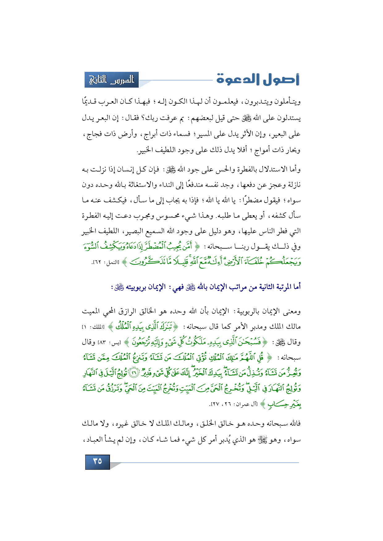 ومعنى الإيمان بالربوبية: الإيمان بأن الله وحده هو الخالق الرازق المحي المميت مالك الملك ومدبر الأمر كما قال سبحانه: {تَبَارَكَ الَّذِي بِيَدِهِ الْمُلْكُ} (الملك: 1) وقال -عز وجل-: {فَسُبْحَانَ الَّذِي بِيَدِهِ مَلَكُوتُ كُلِّ شَيْءٍ وَإِلَيْهِ تُرْجَعُونَ} (يس: 83) وقال سبحانه: {قُلِ اللَّهُمَّ مَالِكَ الْمُلْكِ تُؤْتِي الْمُلْكَ مَنْ تَشَاءُ وَتَنْزِعُ الْمُلْكَ مِمَّنْ تَشَاءُ وَتُعِزُّ مَنْ تَشَاءُ وَتُذِلُّ مَنْ تَشَاءُ بِيَدِكَ الْخَيْرُ إِنَّكَ عَلَى كُلِّ شَيْءٍ قَدِيرٌ * تُولِجُ اللَّيْلَ فِي النَّهَارِ وَتُولِجُ النَّهَارَ فِي اللَّيْلِ وَتُخْرِجُ الْحَيَّ مِنَ الْمَيِّتِ وَتُخْرِجُ الْمَيِّتَ مِنَ الْحَيِّ وَتَرْزُقُ مَنْ تَشَاءُ بِغَيْرِ حِسَابٍ} (آل عمران: 26، 27).
