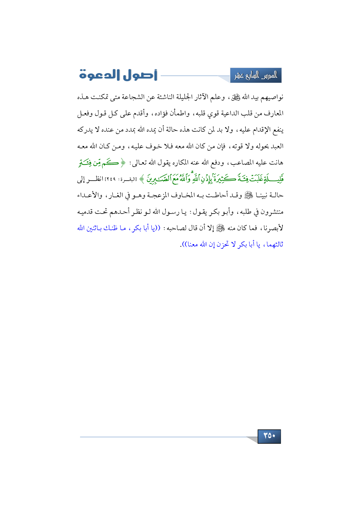 نواصيهم بيد الله عز وجل، وعلم الآثار الجليلة الناشئة عن الشجاعة متى تمكنت هذه المعارف من قلب الداعية قوي قلبه، واطمأن فؤاده، وأقدم على كل قول وفعل ينفع الإقدام عليه، ولا بد لمن كانت هذه حالة أن يمده الله بمدد من عنده لا يدركه العبد بحوله ولا قوته، فإن من كان الله معه فلا خوف عليه، ومن كان الله معه هانت عليه المصاعب، ودفع الله عنه المكاره يقول الله تعالى: {كَمْ مِنْ فِئَةٍ قَلِيلَةٍ غَلَبَتْ فِئَةً كَثِيرَةً بِإِذْنِ اللَّهِ وَاللَّهُ مَعَ الصَّابِرِينَ} (البقرة: 249) انظر إلى حالة نبينا -صلوات الله وسلامه عليه- وقد أحاطت به المخاوف المزعجة وهو في الغار، والأعداء منتشرون في طلبه، وأبو بكر يقول: يا رسول الله لو نظر أحدهم تحت قدميه لأبصرنا، فما كان منه -صلى الله عليه وسلم- إلا أن قال لصاحبه: ((يا أبا بكر، ما ظنك باثنين الله ثالثهما، يا أبا بكر لا تحزن إن الله معنا)).