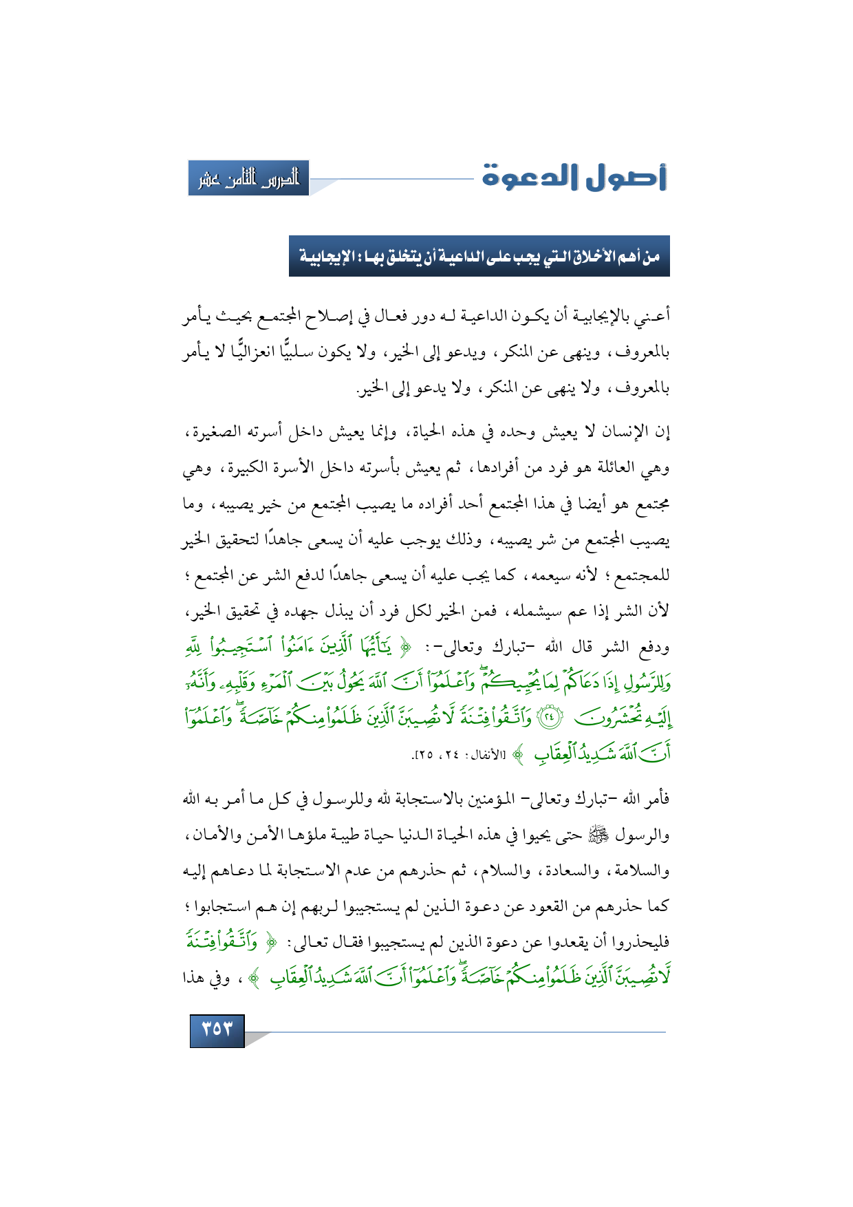 أعني بالإيجابية أن يكون الداعية له دور فعال في إصلاح المجتمع بحيث يأمر بالمعروف، وينهى عن المنكر، ويدعو إلى الخير، ولا يكون سلبيًّا انعزاليًّا لا يأمر بالمعروف، ولا ينهى عن المنكر، ولا يدعو إلى الخير.