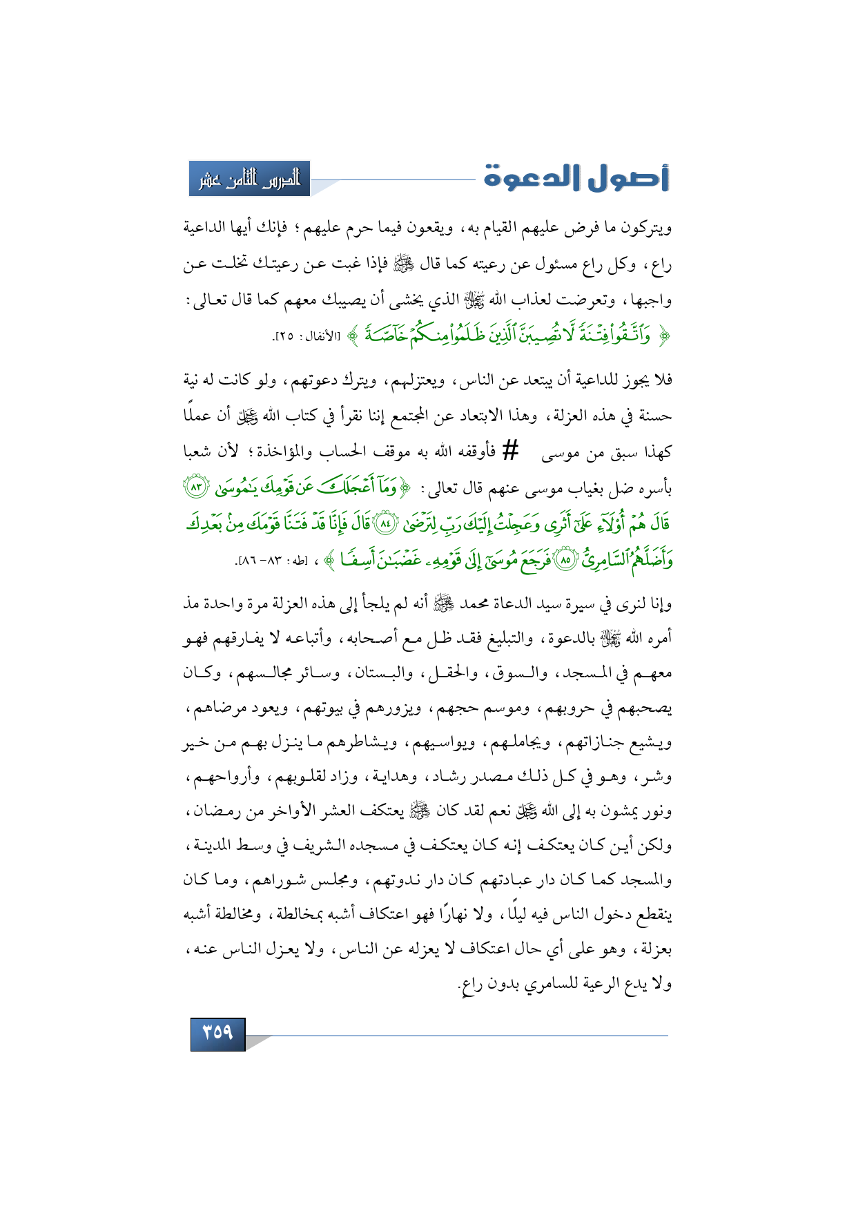 فلا يجوز للداعية أن يبتعد عن الناس، ويعتزلهم، ويترك دعوتهم، ولو كانت له نية حسنة في هذه العزلة، وهذا الابتعاد عن المجتمع إننا نقرأ في كتاب الله -عز وجل- أن عملًا كهذا سبق من موسى -عليه السلام- فأوقفه الله به موقف الحساب والمؤاخذة؛ لأن شعبا بأسره ضل بغياب موسى عنهم قال تعالى: {وَمَا أَعْجَلَكَ عَنْ قَوْمِكَ يَا مُوسَى * قَالَ هُمْ أُولَاءِ عَلَى أَثَرِي وَعَجِلْتُ إِلَيْكَ رَبِّ لِتَرْضَى * قَالَ فَإِنَّا قَدْ فَتَنَّا قَوْمَكَ مِنْ بَعْدِكَ وَأَضَلَّهُمُ السَّامِرِيُّ * فَرَجَعَ مُوسَى إِلَى قَوْمِهِ غَضْبَانَ أَسِفًا}، (طه: 83 - 86).