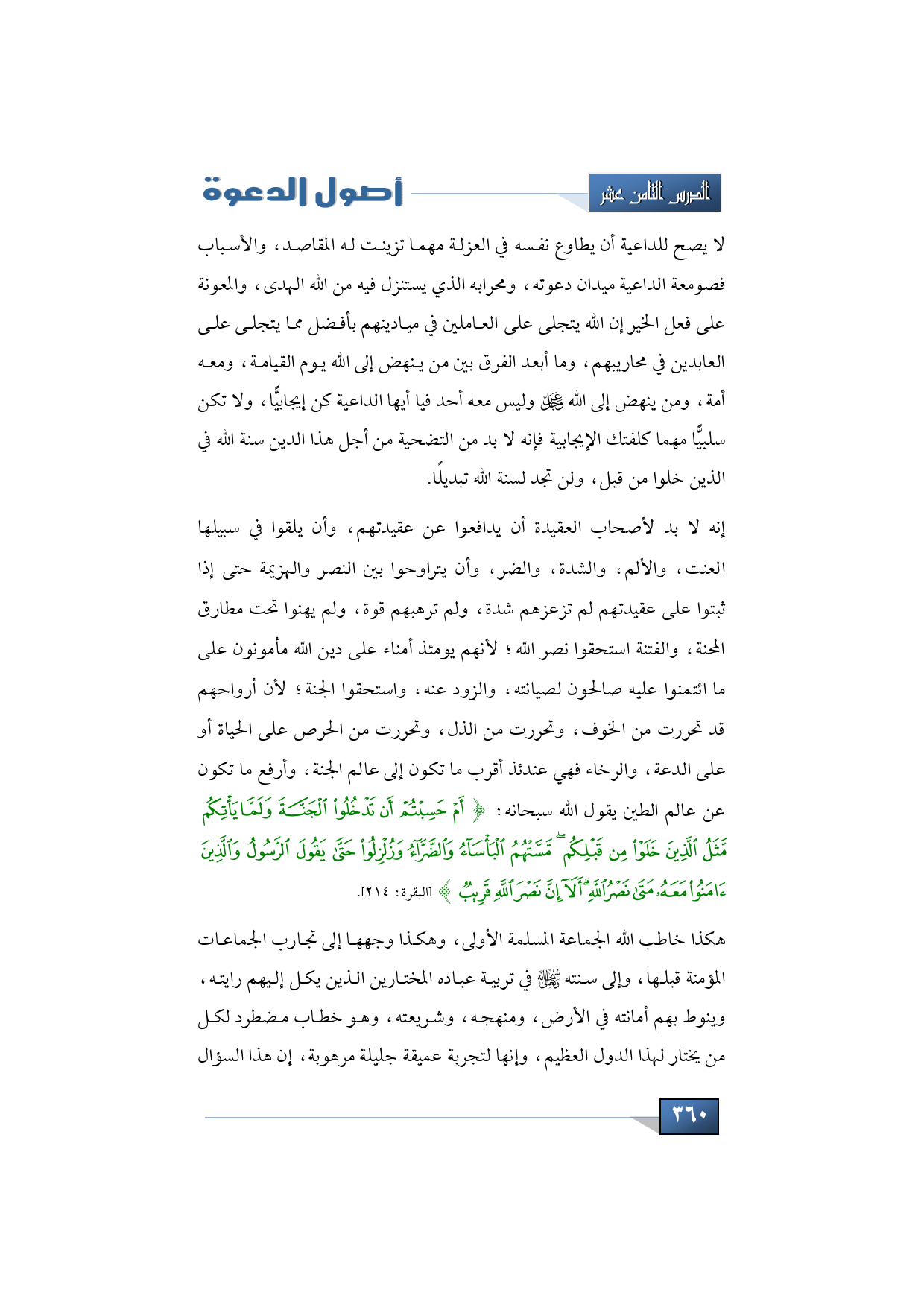 لا يصح للداعية أن يطاوع نفسه في العزلة مهما تزينت له المقاصد، والأسباب فصومعة الداعية ميدان دعوته، ومحرابه الذي يستنزل فيه من الله الهدى، والمعونة على فعل الخير إن الله يتجلى على العاملين في ميادينهم بأفضل مما يتجلى على العابدين في محاريبهم، وما أبعد الفرق بين من ينهض إلى الله يوم القيامة، ومعه أمة، ومن ينهض إلى الله -عز وجل- وليس معه أحد فيا أيها الداعية كن إيجابيًّا، ولا تكن سلبيًّا مهما كلفتك الإيجابية فإنه لا بد من التضحية من أجل هذا الدين سنة الله في الذين خلوا من قبل، ولن تجد لسنة الله تبديلًا.